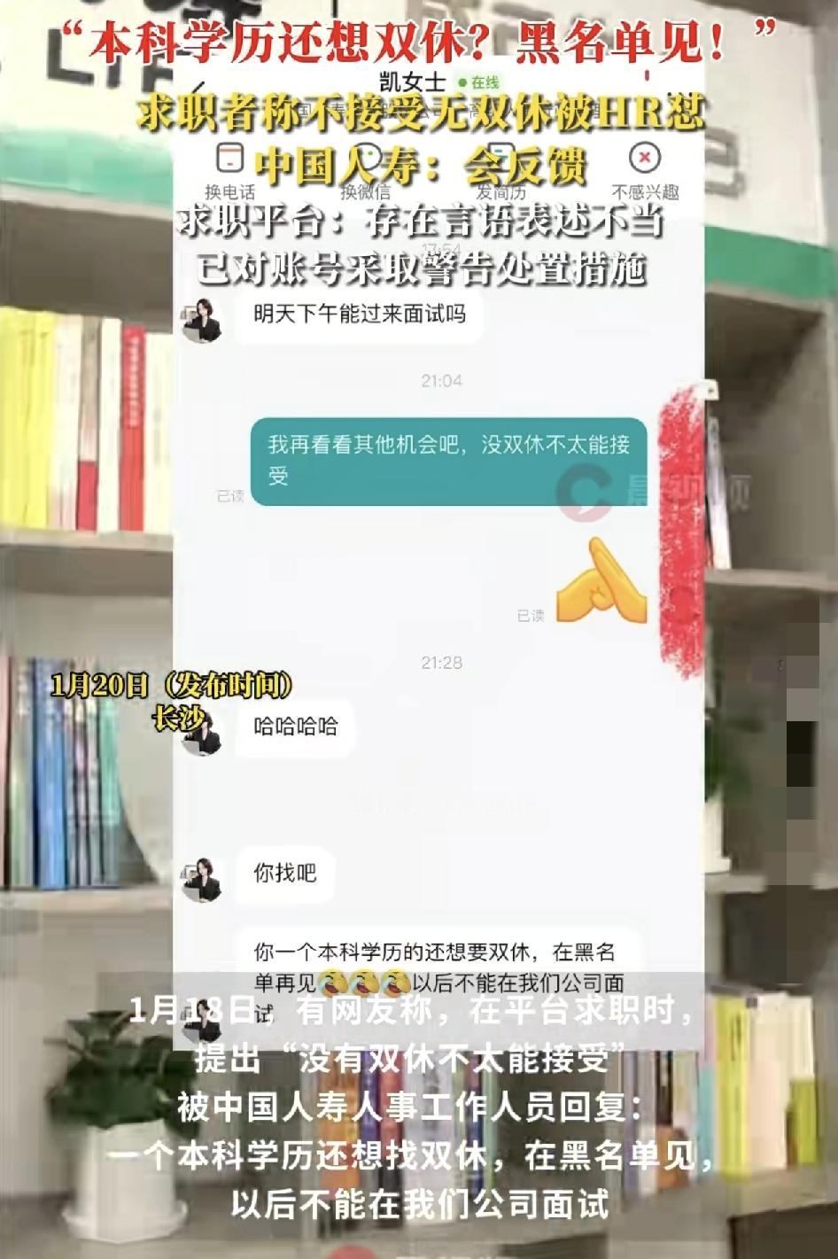 长沙一本科学历毕业生在招聘平台上投递简历,因为对方公司没有双休的待遇,所以无法接受。没想到 公司的HR是这样回复的:本科学历还想着双休。那就在黑名单上见,以后也别想着在我们公司面试了。平台表示,这位人力资源的经理言语表述确实有不当的情况,已经对其账号进行了警告处理。不过很多网友说现在这样的公司单休的情况是很多,即便是双休,平常在家里也不能闲着。
