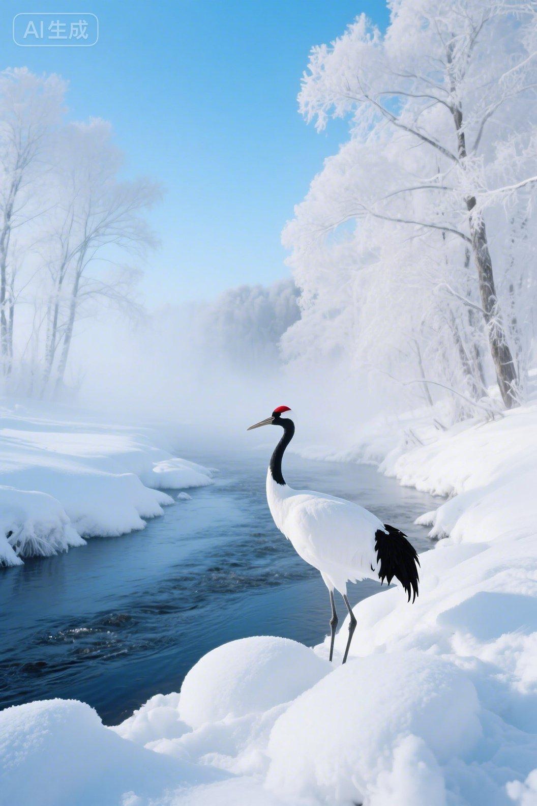 雪落冰河,仙鹤为冬添一抹仙