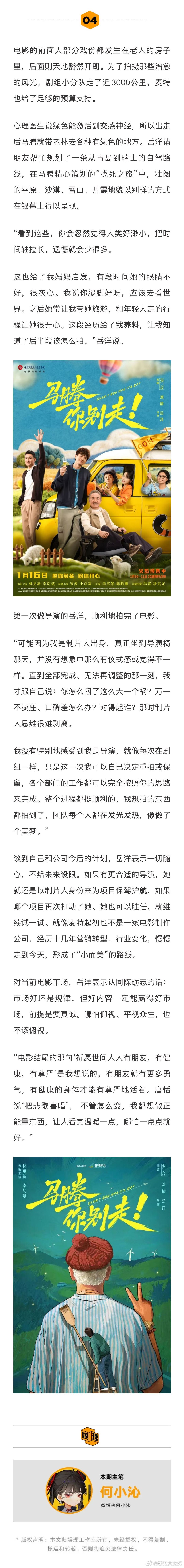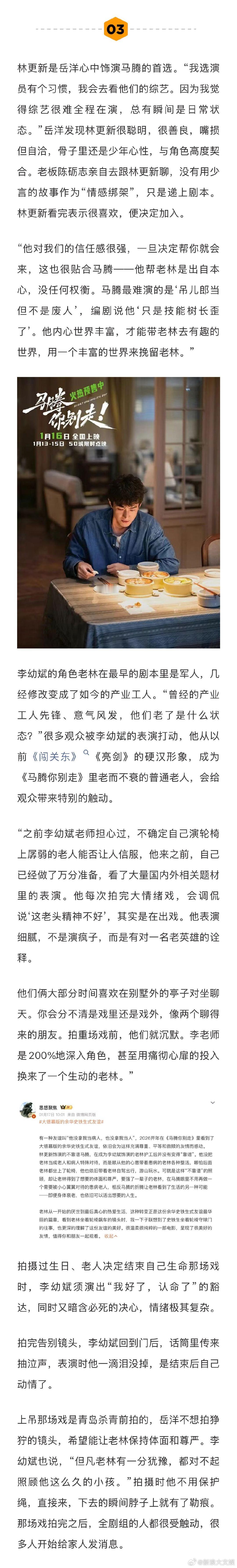 一部编剧遗作的诞生幕后 马腾导演看综艺选中林更新 《马腾你别走》导演岳洋:“这个剧本原本叫《海里的神奇干爹》,因为原本的结局是开放式,老林和马腾偷偷跑出来到海边。后来改成《马腾你别走》,是一个双关,既是故事中老林希望马腾别走,也是我们对少言的祝福。虽然有人说是不是应该改个片名,但我想把这个美好的祝福留下来。”娱理独家↓