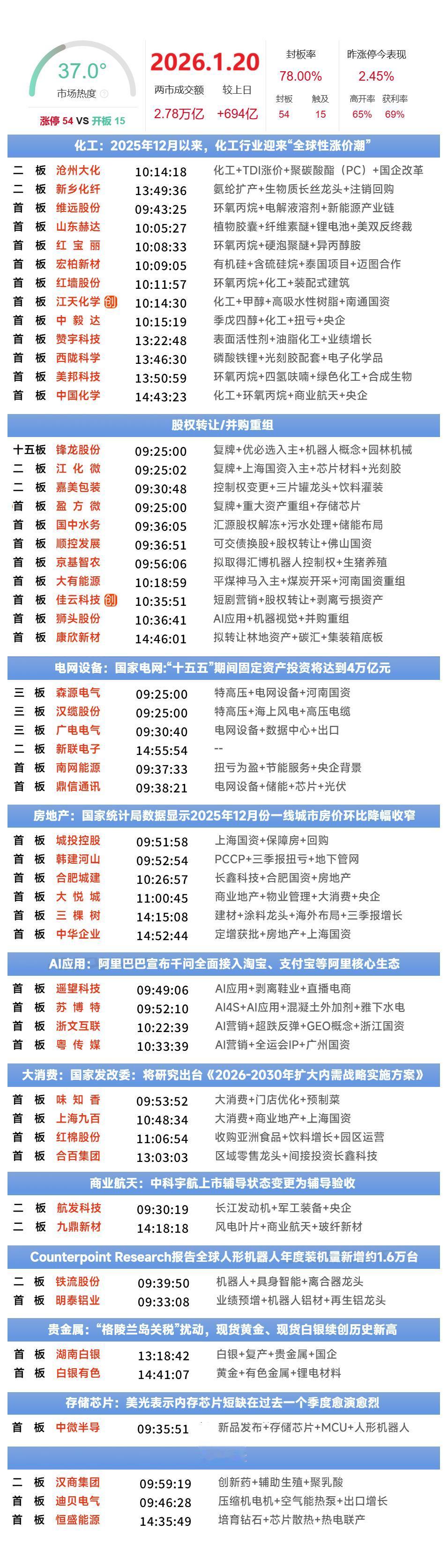 1月20日涨停复盘 | 化工板块逆势爆发,贵金属概念延续强势,AI应用端局部走高