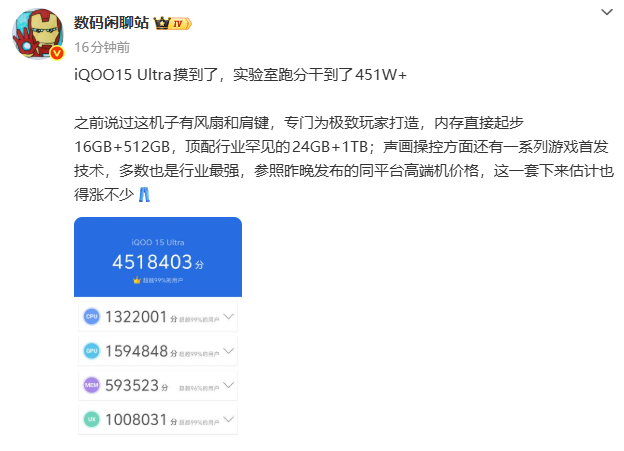 iQOO 15 Ultra这么顶?!451W+跑分,年底性能王炸Ultra呀