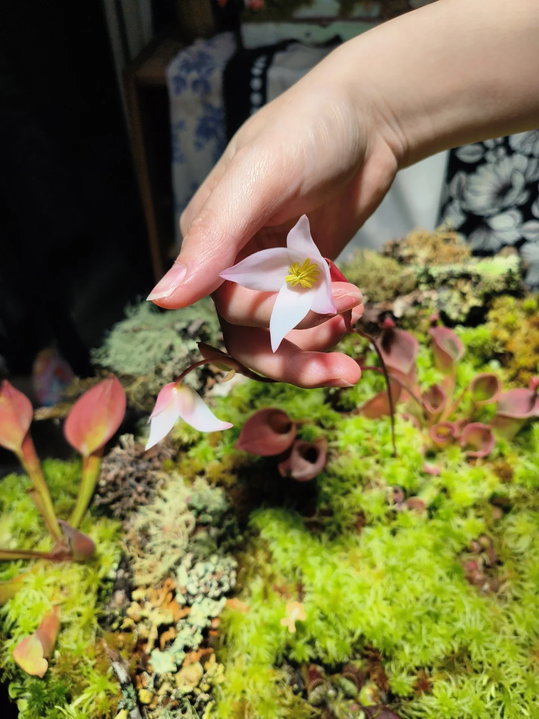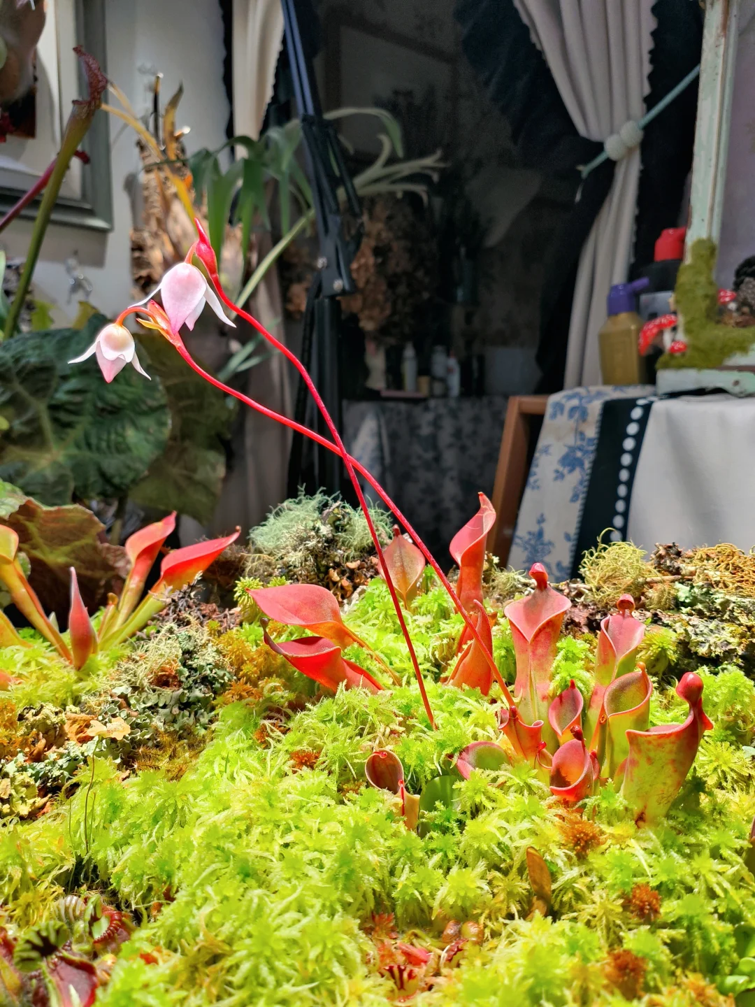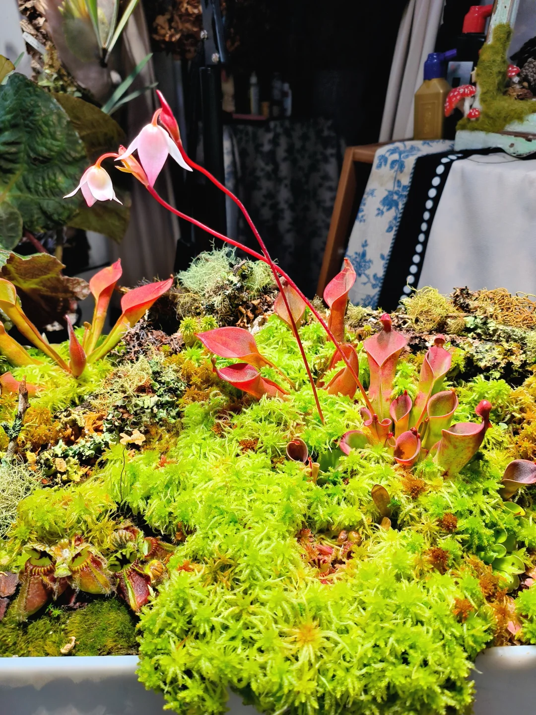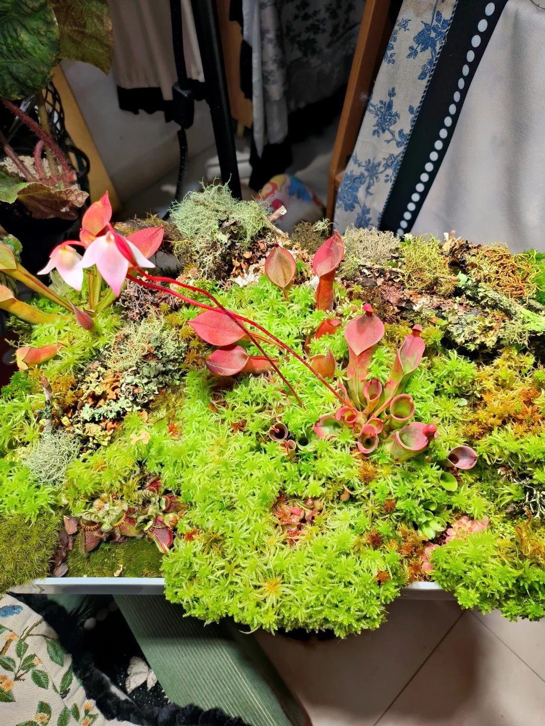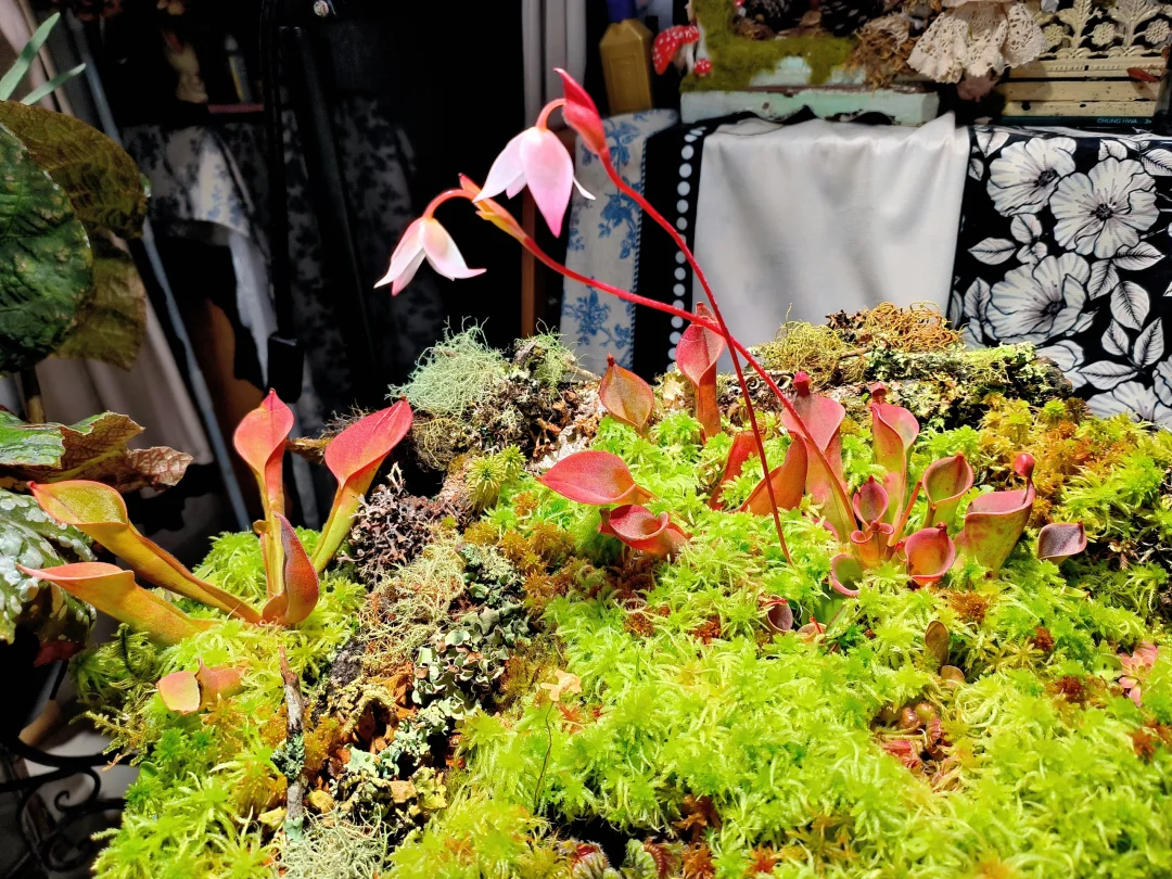 等了1个半月,太阳瓶终于开花了[皱眉R][皱眉R] 12月初做了这个食虫盘,用了大量的地衣、苔藓、活水苔和食虫植物 1.活水苔真的太能长了,长高了起码2/3cm,全部覆盖了最初的模样 2.把原先的捕虫堇挪了位置,原先的位置被水苔占领了 3.土瓶草还是更适合与苔藓做造景,活水苔太容易把土瓶吞没了 4.地衣经过环境适应,存活的下来的就是图上这些,损耗是必然的,毕竟野外环境难以模仿,能存活就很好了 5.太阳瓶很皮实,已经陆续在长新瓶子啦[色色R]