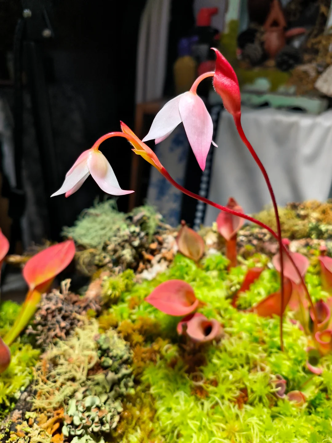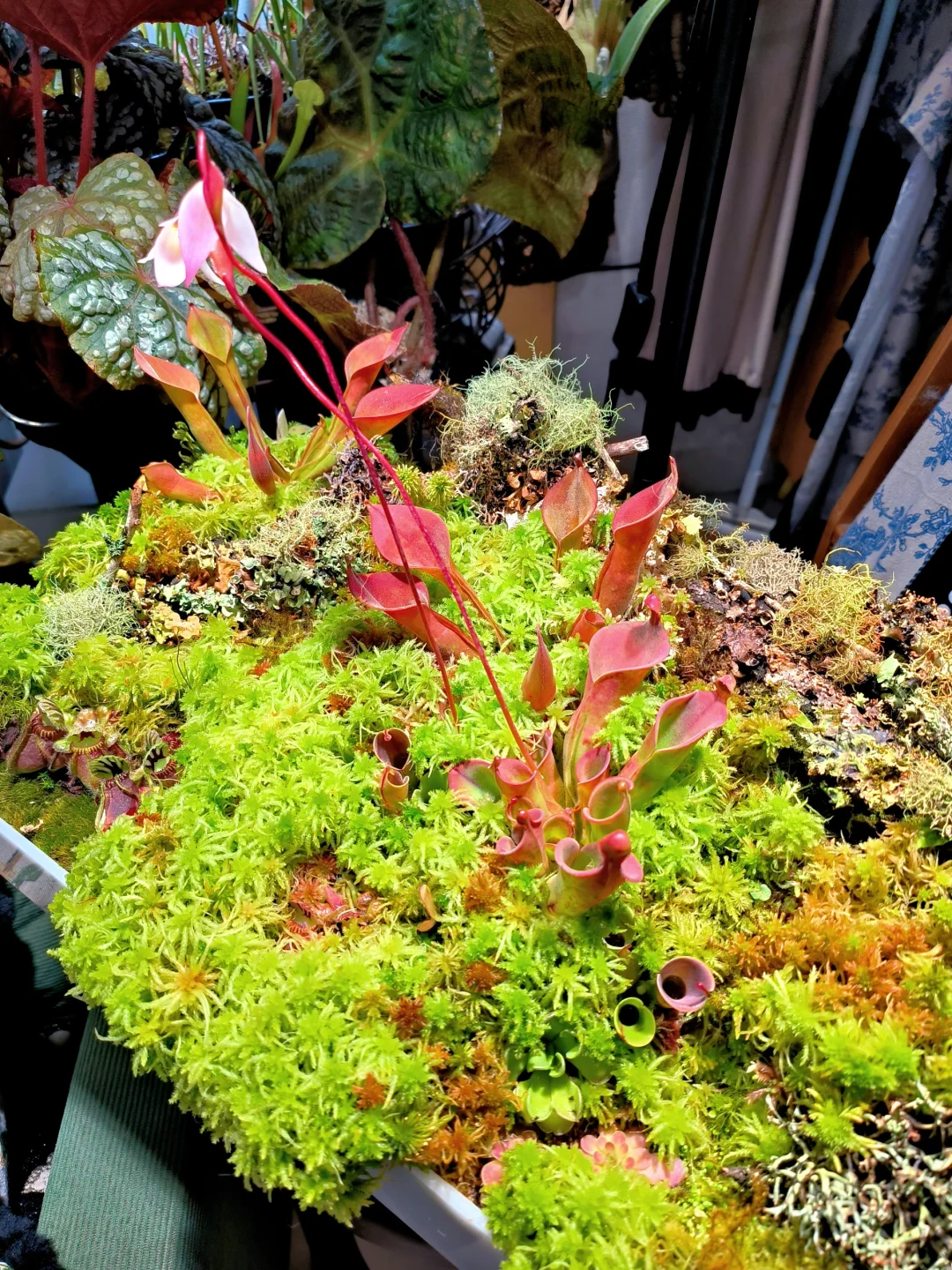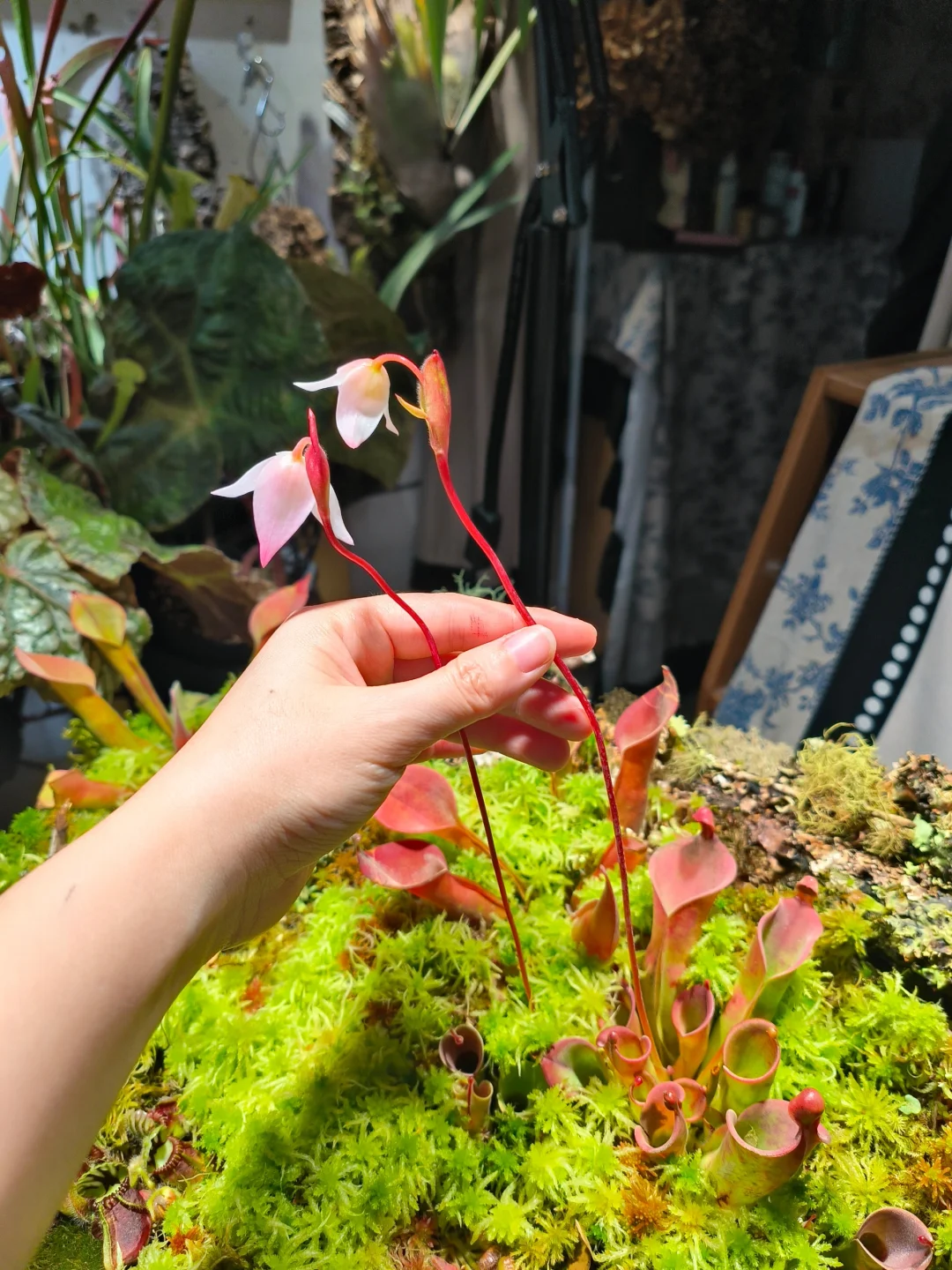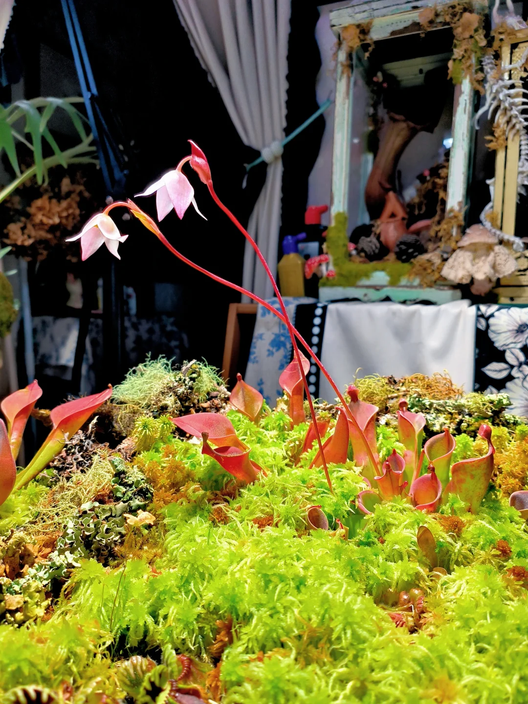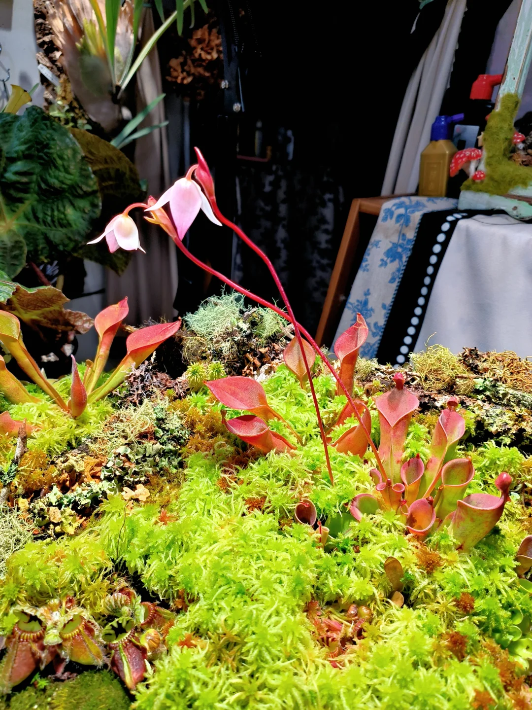 等了1个半月,太阳瓶终于开花了[皱眉R][皱眉R] 12月初做了这个食虫盘,用了大量的地衣、苔藓、活水苔和食虫植物 1.活水苔真的太能长了,长高了起码2/3cm,全部覆盖了最初的模样 2.把原先的捕虫堇挪了位置,原先的位置被水苔占领了 3.土瓶草还是更适合与苔藓做造景,活水苔太容易把土瓶吞没了 4.地衣经过环境适应,存活的下来的就是图上这些,损耗是必然的,毕竟野外环境难以模仿,能存活就很好了 5.太阳瓶很皮实,已经陆续在长新瓶子啦[色色R]