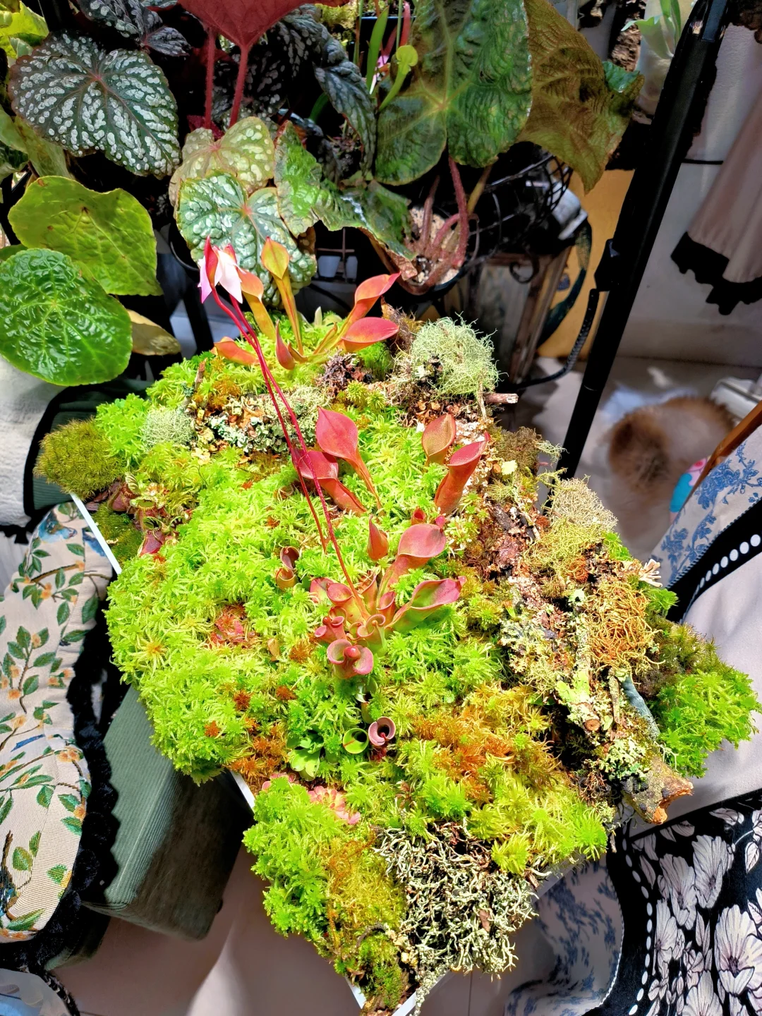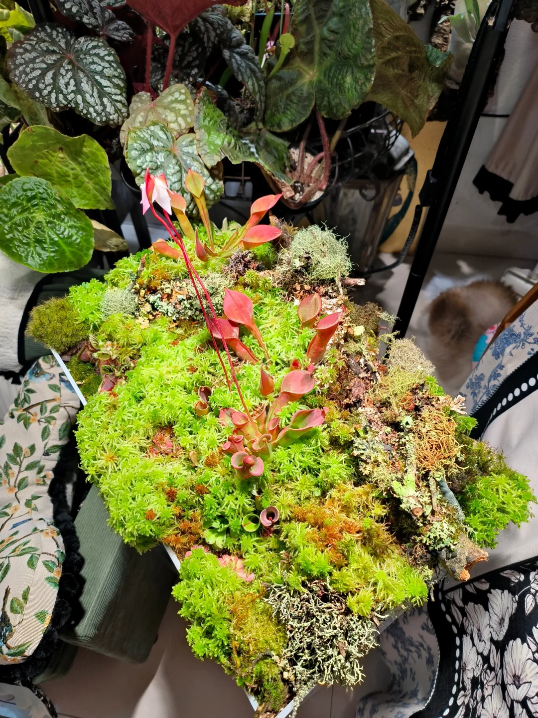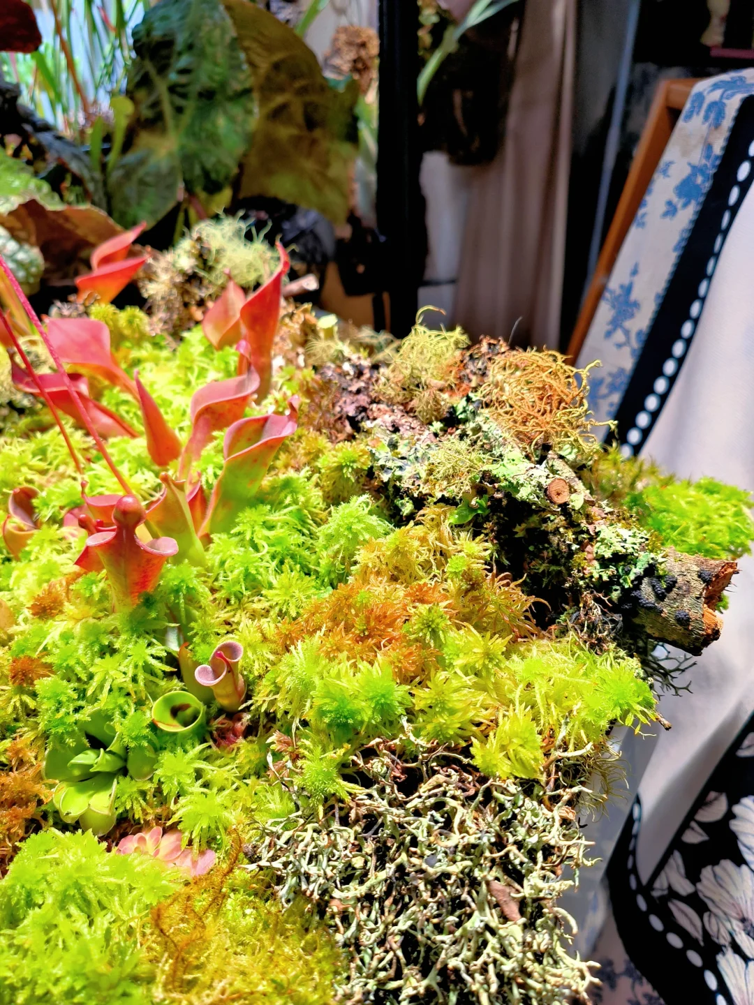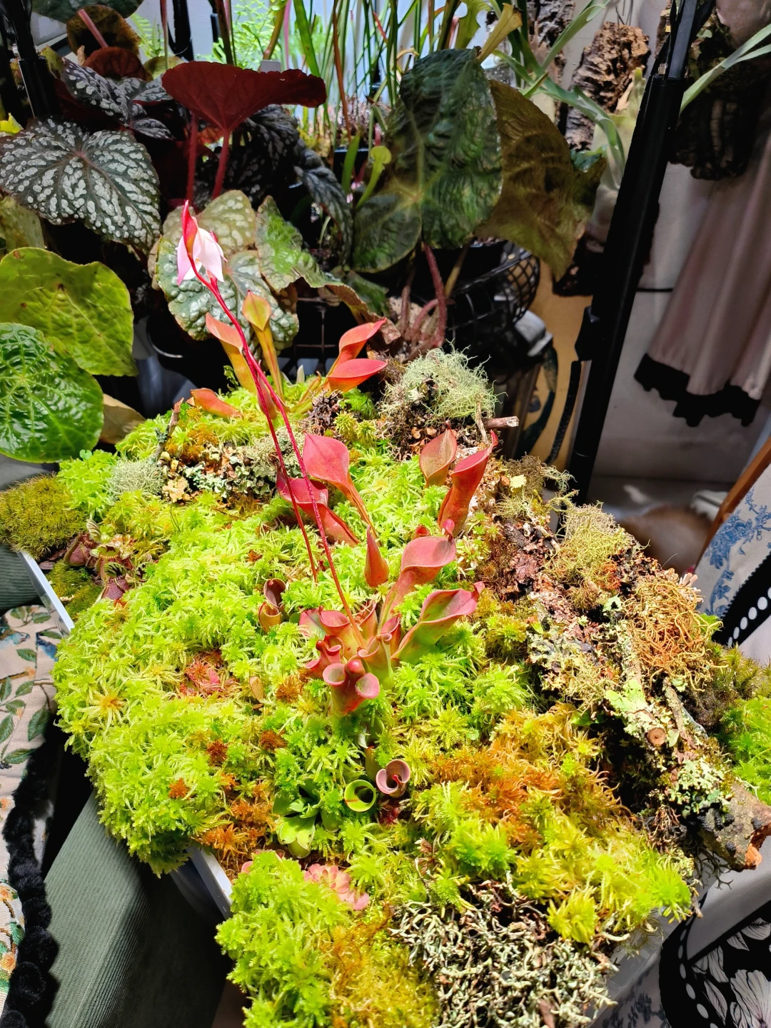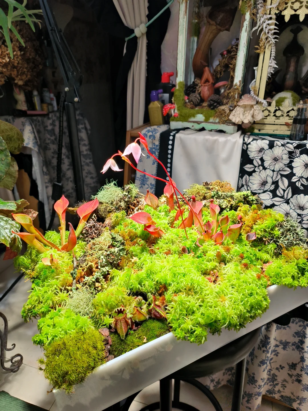 等了1个半月,太阳瓶终于开花了[皱眉R][皱眉R] 12月初做了这个食虫盘,用了大量的地衣、苔藓、活水苔和食虫植物 1.活水苔真的太能长了,长高了起码2/3cm,全部覆盖了最初的模样 2.把原先的捕虫堇挪了位置,原先的位置被水苔占领了 3.土瓶草还是更适合与苔藓做造景,活水苔太容易把土瓶吞没了 4.地衣经过环境适应,存活的下来的就是图上这些,损耗是必然的,毕竟野外环境难以模仿,能存活就很好了 5.太阳瓶很皮实,已经陆续在长新瓶子啦[色色R]