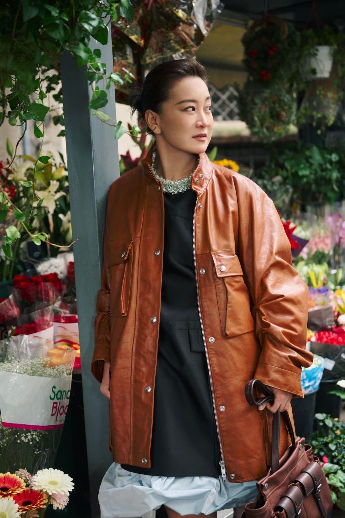 先扒一扒这件引爆话题的“战袍”:Prada当季新款皮质风衣,做旧质感自带复古buff,硬挺面料衬得肩背线条挺拔利落,却偏搭了条黑色缎面半裙,裙摆的褶皱花边像给硬朗的皮衣加了层“温柔滤镜”。同色系皮质手袋压场,尖头高跟鞋拉长比例,全套大牌加持却没有半分刻意的精致感,反倒透着股“我穿得舒服,你们随意评”的松弛劲儿。最妙的是那紧贴头皮的盘发,彻底暴露饱满额头,把往日喜剧人的憨态一扫而空,只剩百亿女导演的沉静笃定,这种“娘man平衡”的混搭,比秀场上的超模走秀更有故事感。