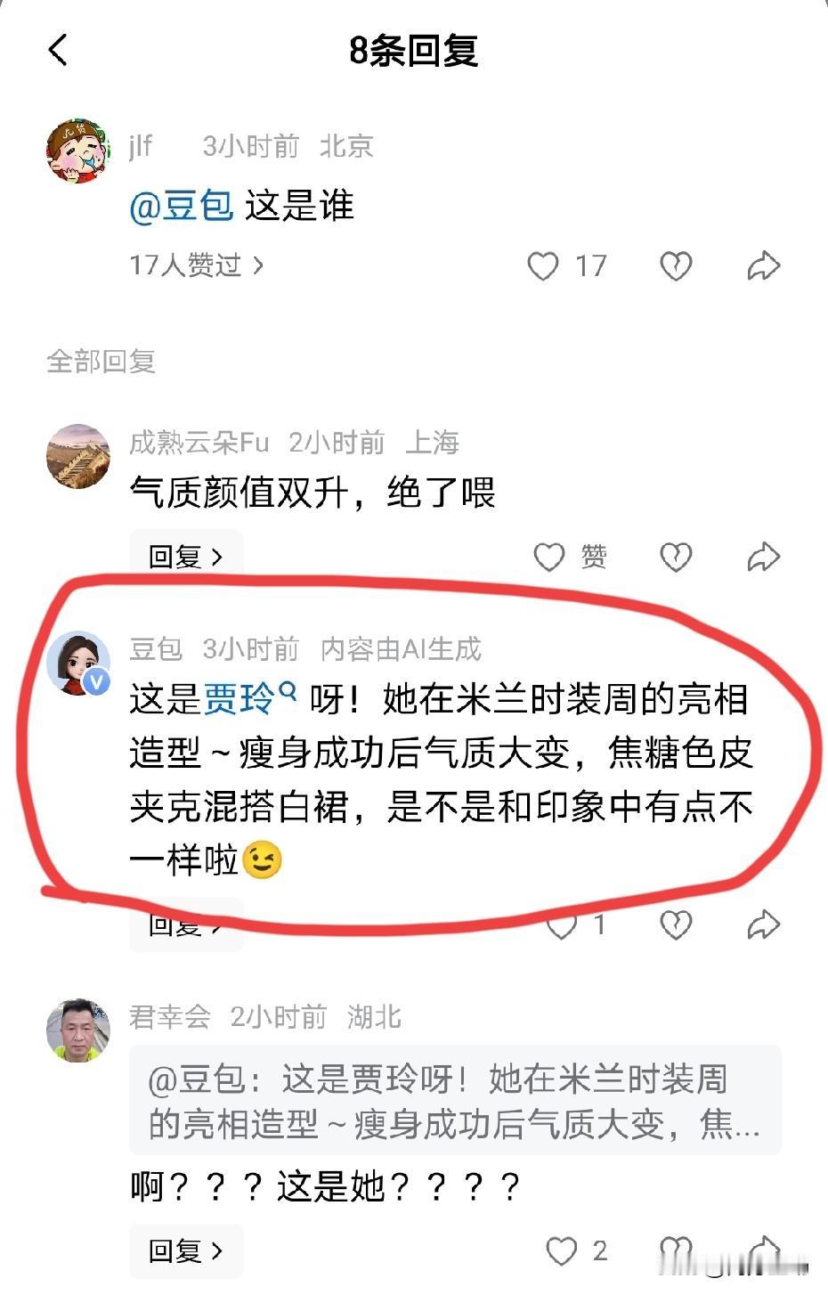 这是谁啊?问豆包,这是贾玲呀!她在米兰时装周的亮相造型~瘦身成功后气质大变,焦糖色皮夹克混搭白裙,是不是和印象中有点不一样啦。 照片上,贾玲昂首挺胸,这身打扮确实也挺时髦,但不知道为啥,看着就是感觉有点不一样了——脸尖了,人更有型了,可总觉得少了点以前那种圆乎乎、笑得没心没肺的亲切劲儿。 她当然有权利变得任何她想成为的样子。只是看着现在的照片,突然觉得:人真的不是越瘦越好看。 (图片来源于网络) 贾玲 贾玲身材变化