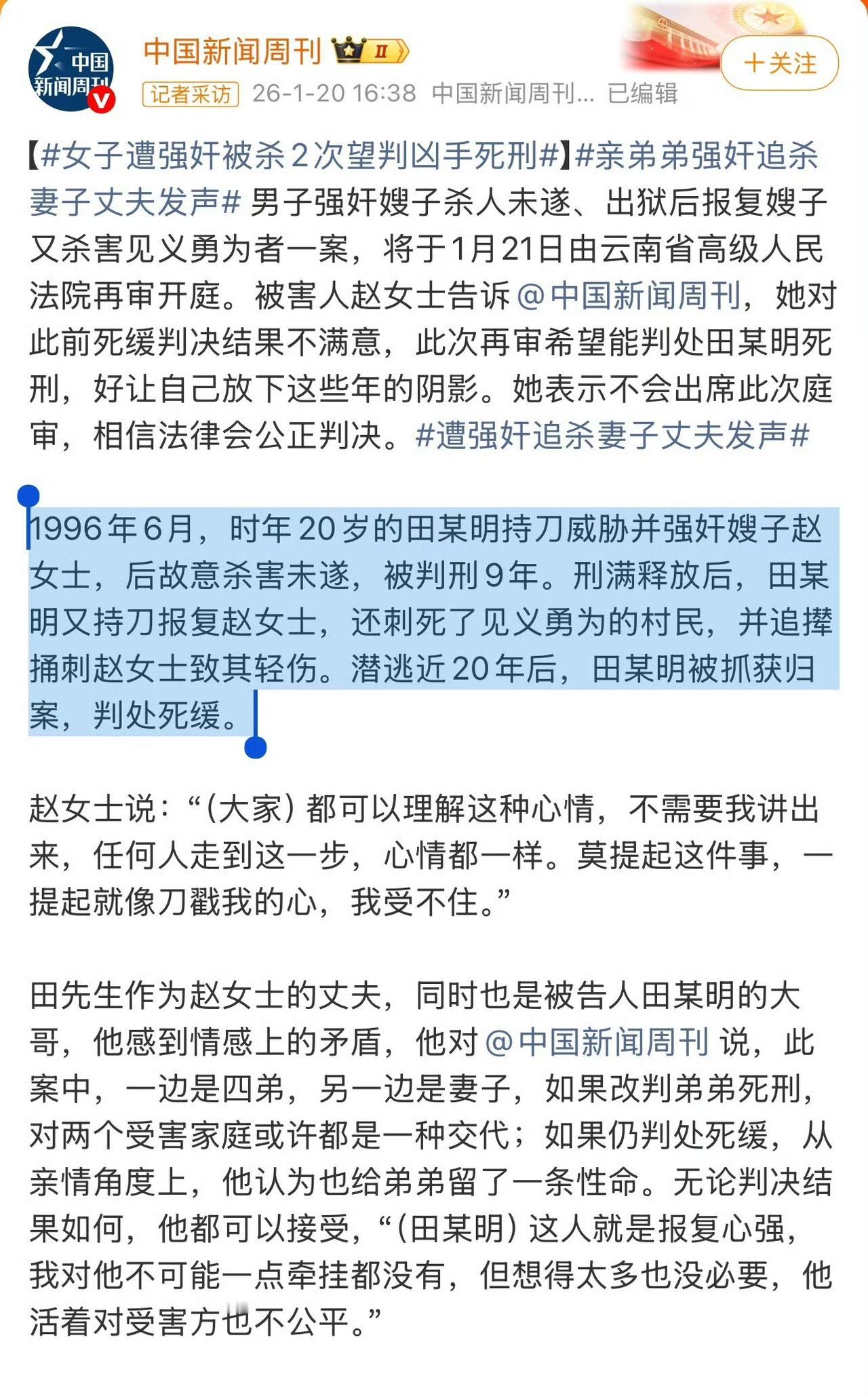 事实证明, 有些人天生恶种, 就不配有重新做人的机会! 29年前qj嫂子未遂的田某明,一而再,再而三的犯罪,但云南省高级人民法院一二审仍判处他死缓,法院认定他系累犯但以非必须立即执行为由未判死刑。 1996年,田某明持刀强奸亲嫂子赵女士未遂,数日后追杀未果。 2002年刑满释放后,蓄意报复赵女士,持刀闯入其家中行凶。见义勇为村民刘铭富阻拦时被刺死,赵女士身中多刀致轻伤。 田某明潜逃20年毫无悔意,2022年落网后庭审中仍诬陷刘铭富是赵女士推向刀尖。 我实在不明白,这样的人,为什么一再给他犯错的机会,难道受害者的血泪,在某些冰冷的条文面前,就轻如鸿毛吗? 一次作恶是歹毒,二次行凶是疯狂,潜逃二十年是泯灭人性,庭审上颠倒黑白更是丧尽天良!这样的累犯,哪一点配得上“非必须立即执行”? 见义勇为的刘铭富,为了保护邻居惨死刀下,他的家人这些年是怎么熬过来的?赵女士二十多年活在恐惧阴影里,身心俱疲,公道却迟迟不到! 恶种就是恶种, 别指望他能回头是岸!法律的底线,难道不是守护良善、严惩恶魔吗?这样的判决,寒的是千千万万普通人的心,更是让见义勇为的热血,凉了半截!