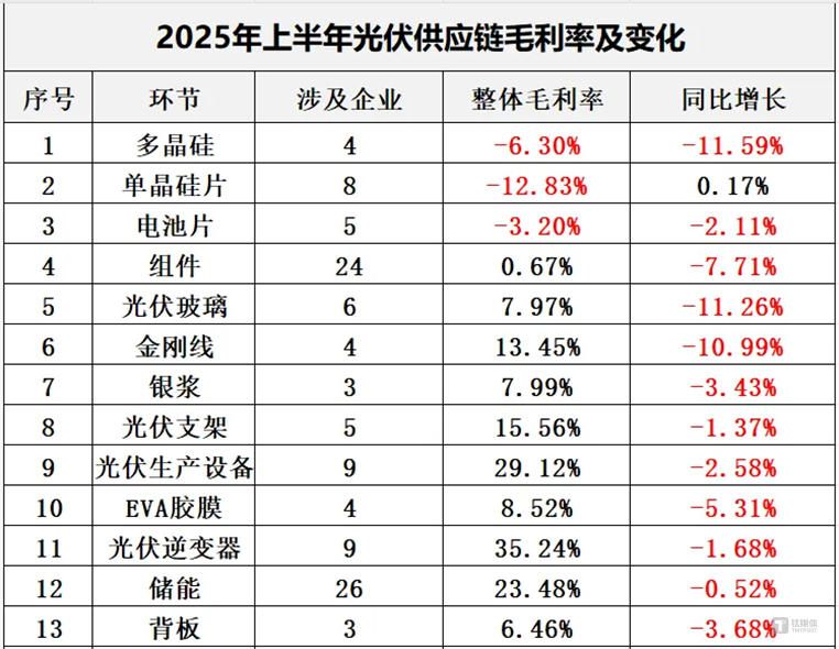 毛利率极具参考性:2025上半年,多晶硅整体毛利率已经跌至-6.30%,组件的毛利率只有0.67%。而在2022年,多晶硅的整体毛利率是73%,所有环节的厂商均盈利。