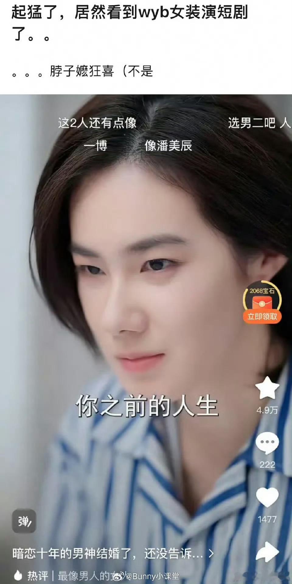 观众注意到演员间存在的外形相似点。这种现象在演艺行业里时有发生。最终演员依靠自身实力赢得认可。短剧女演员酷似王一博差点认成王一博