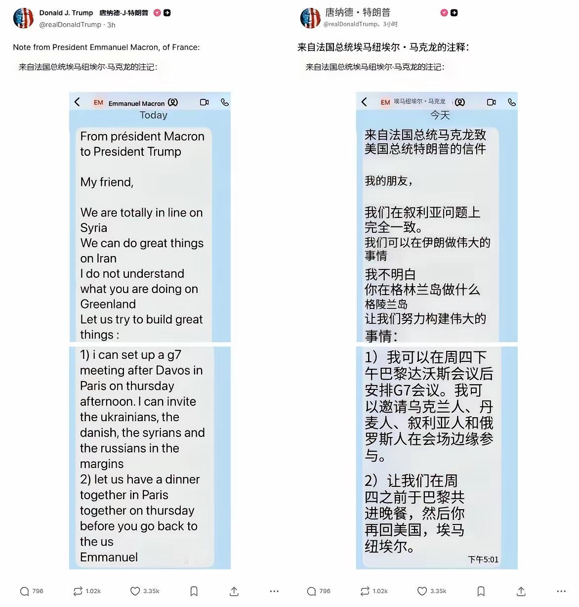 特朗普曝光的马克龙短信,你能解读几层政治信号? 马克龙前脚泄露特朗普要诺贝尔和平奖的内幕,特朗普接着就把法国总统马克龙发的短信在X(原 Twitter)上公开。 俩人就像小孩子吵架揭短没啥意思,倒是马克龙的短信内容颇有意思。 马克龙的短信至少涉及5点信号: 1-叙利亚,法美完全一致共同进退。 ==当下叙利亚朱拉尼正在利用库尔德对付伊朗兵力空虚抢占地盘。 这必然损害了美国利益,特朗普很可能提议与法国一起对叙利亚局势进行干预。 2-伊朗 “可以做伟大的事”……法国赞同美国即将采取的行动。 ==美国一直在向中东集结兵力,英法也在调动兵力,看起来法国愿意配合美国对伊朗进行武装行动。 3-格陵兰 “我不明白你在格陵兰岛做什么” ==法国不同意美国做法。 4-G7会议安排 达沃斯论坛结束后,周四下午在巴黎办G7会议,还邀请乌克兰、丹麦、叙利亚、俄罗斯代表 “在会场边缘参与”(非正式列席)。 ==乌克兰丹麦叙利亚俄罗斯额外出席,这个额外出席涉及俄乌冲突、格陵兰岛、叙利亚局势。 5-私人晚宴招待特朗普 周四在巴黎共进晚餐,之后特朗普再返回美国。 ==似乎想改善与特朗普关系 特朗普曝光短信内容本身说明特朗普并不重视法国意见,这种不尊重的态度必然导致美法关系会有矛盾。 可能会促成欧洲抛开美国成立新的军事同盟。 你还能发现其他政治信息吗? 欧洲对特朗普 法国马克龙 特朗普诺奖