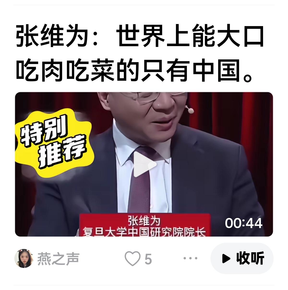 【美国在张维为嘴里已经无可救药了】 张维为:美国的高速公路我都不好意思讲,还不如我们的贫困县。 世界上能大口大口吃肉,只有我们,我们农民工的一顿午餐比美国中产阶级吃得好。 美国抓捕马杜罗,都不敢地面进攻,这次行动暴露美国弱势,软实力荡然无存。 有网友调侃,说不收费的高速公路就是最好的高速公路,美国高速路的确陈旧,可是美国人均消费是我们9到11倍。