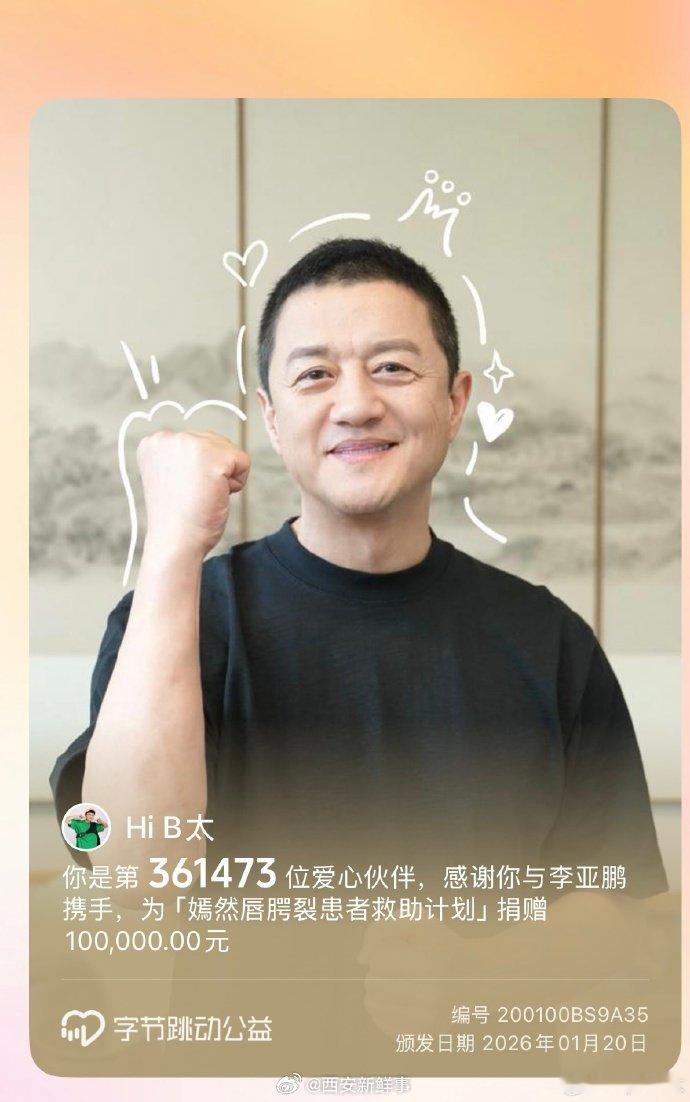 【博主B太为嫣然天使基金捐款10万】博主B太称赞李亚鹏坚持做公益1月20日,发长文谈李亚鹏对唇腭裂患者的帮助,并宣布捐款10万给嫣然唇腭裂患者救助计划,B太表示:这次10万元捐赠在大病家庭群体虽只是绵薄之力,却也是一簇爱的星火。愿这份暖意能够不断传递,更盼我能如李亚鹏老师一般,早日能在重庆建成那座儿童医院旁的爱心大楼,为万千患病儿童的家庭撑起一片遮风挡雨的天地,让每一个宝宝都能在父母的呵护下,健健康康、无忧无虑地成长。