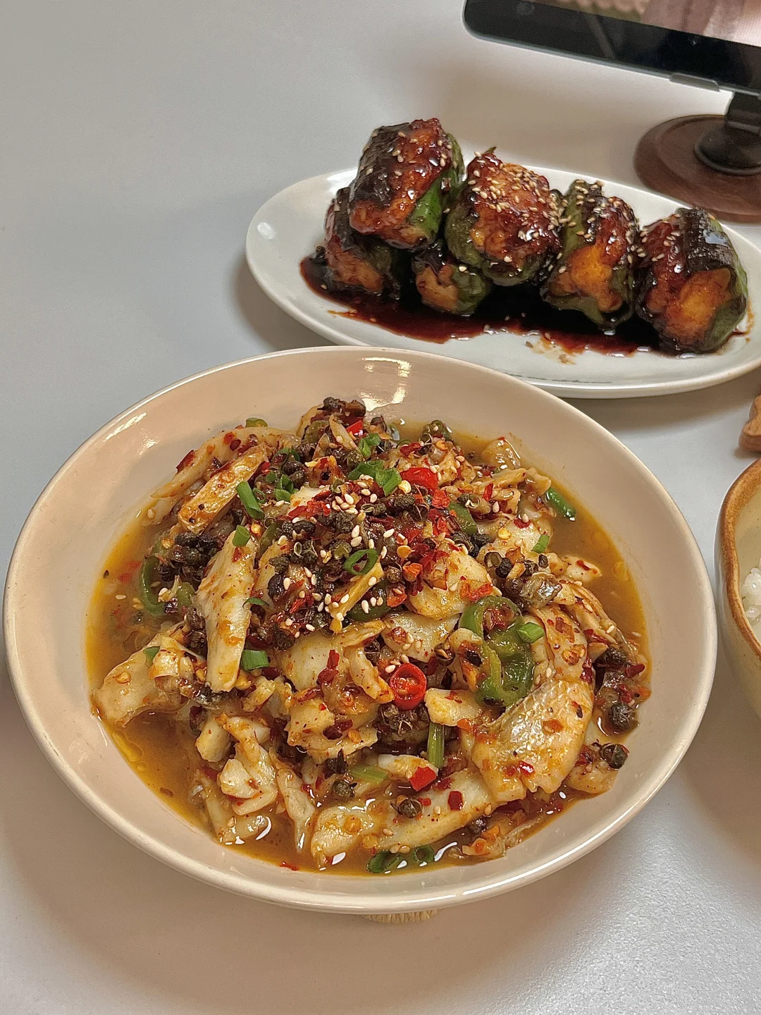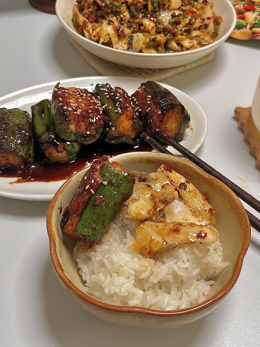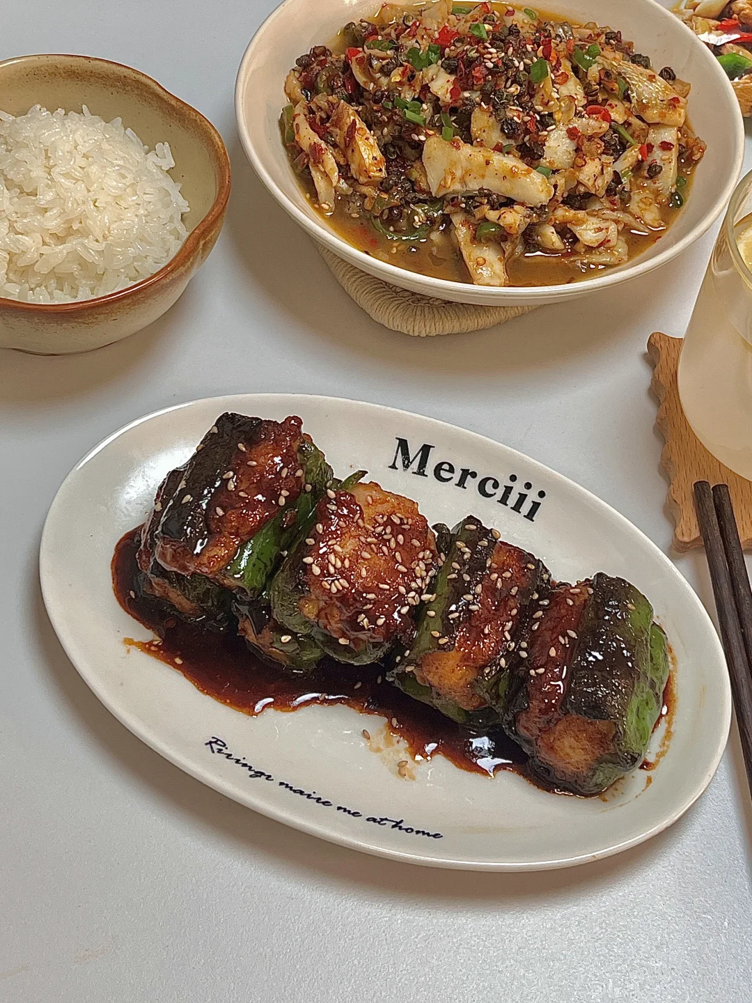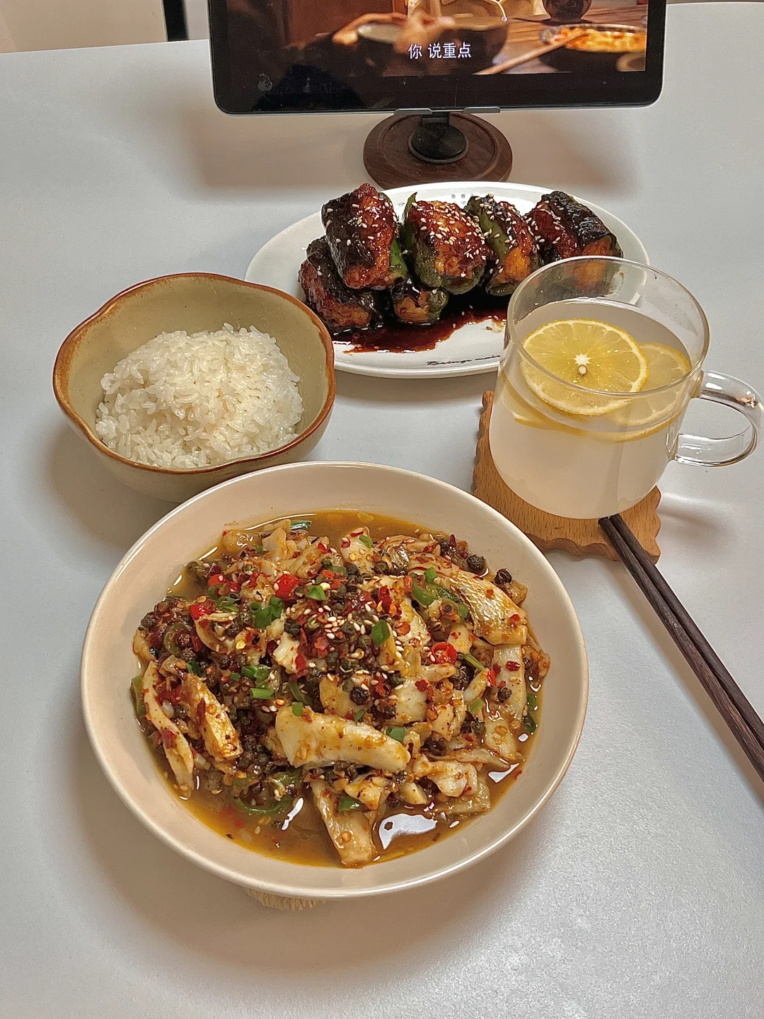 今日份一人食: 青花椒鱼片 青椒酿虾滑 柠檬水 . 青椒酿虾滑 实在太香了,Q 弹爽口,一口咬下去超满足,巨好吃😋裹满了浓郁酱汁味道真的绝了👍🏻 青花椒鱼片 椒麻过瘾,鱼片嫩滑,汤汁又麻又辣,搭配米饭🍚太好吃了,简单好做十分钟搞定,爱吃的宝一定要去试试呀✌🏻