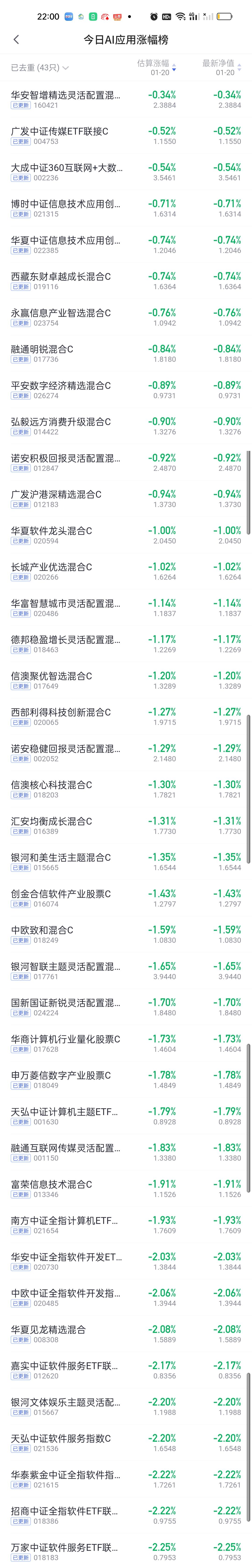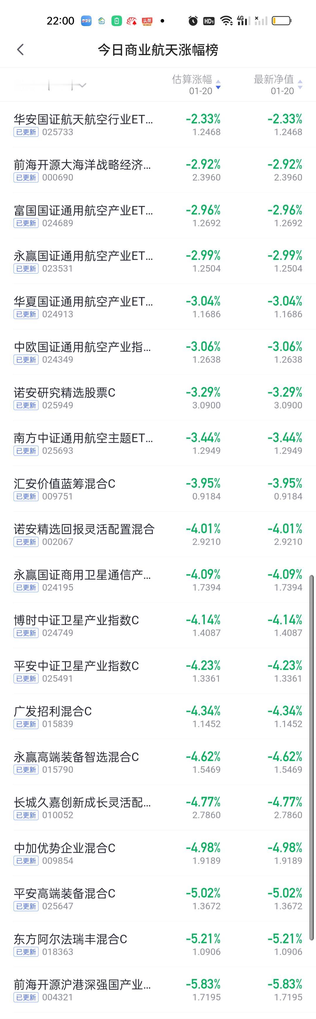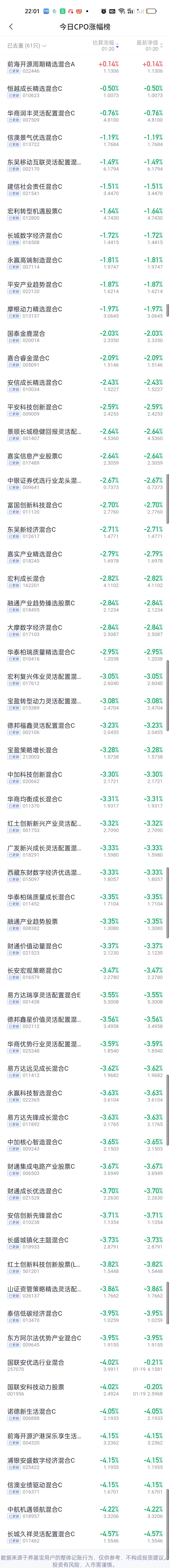 今日基金净值榜已更新完毕。富国价值发现3.92%排名第一,国投瑞银白银期货3.88%排名第二,富国研究精选3.65%排名第三,工银瑞信价值精选3.56%排名第四,景顺长城中国回报3.51%排名第五。 跌幅榜方面,西藏东财景气驱动6.34%排名第一,前海开源沪港深强国产业5.83%排名第二,东方阿尔法瑞丰5.21%排名第三,平安高端装备5.02%排名第四,中加优势企业4.98%排名第五,长城久嘉4.77%排名第六。 商业航天,AI应用,半导体,CPO,机器人,创新药涨幅榜一并奉上!