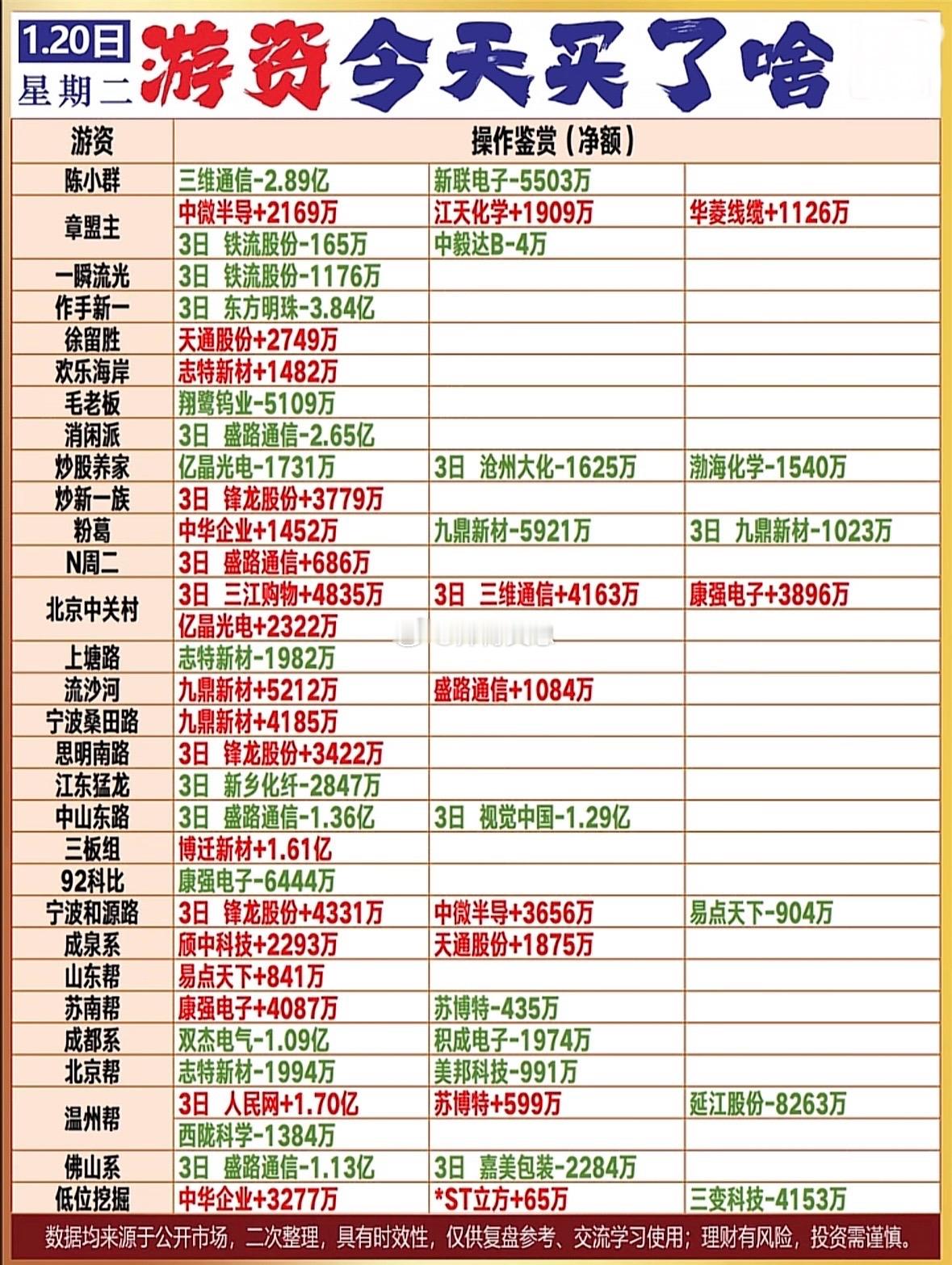 游资龙虎榜数据1月20日流沙河5200万买入九鼎新材章盟主2100万买入中微半导,1000万买入华菱线缆,1900万买入江天化学竞价抢筹3800万买入康强电子,2300万买入亿晶光电,1400万卖出三变科技宁波桑田路4100万买入九鼎新材上塘路1900万卖出志特新材炒股养家1700万卖出亿晶光电,1500万卖出渤海化学低位挖掘4100万卖出三变科技成都系1.09亿卖出双杰电气,1900万卖出积成电子陈小群2.89亿卖出三维通信,5500万卖出新联电子