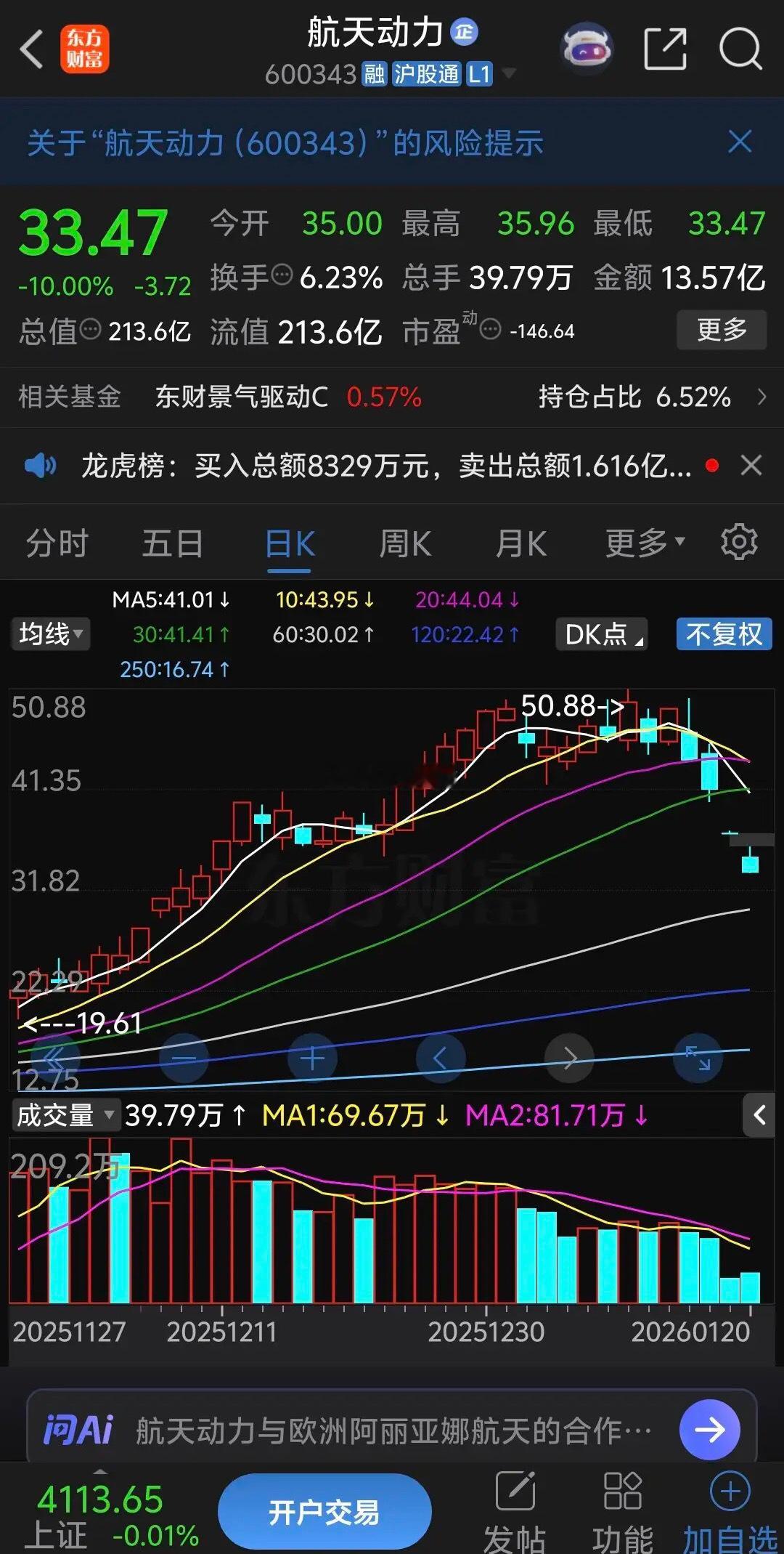 航天动力跌的太惨了,早盘低开5.89%后稍微冲高就快速跳水,恐慌盘纷纷割肉,没过多久就砸向跌停,砸向跌停后再也没有撬开。最近4天有三个跌停板,上周五暴跌6.28%,昨天一字跌停板盘中被抄底资金撬开但是很快又被恐慌盘砸跌停,从早上快速砸跌停可以看出今天走势更加恐慌,明天可能还会有比较大的跌幅,爆炒题材股风险太大了,追高股民惨不忍睹。