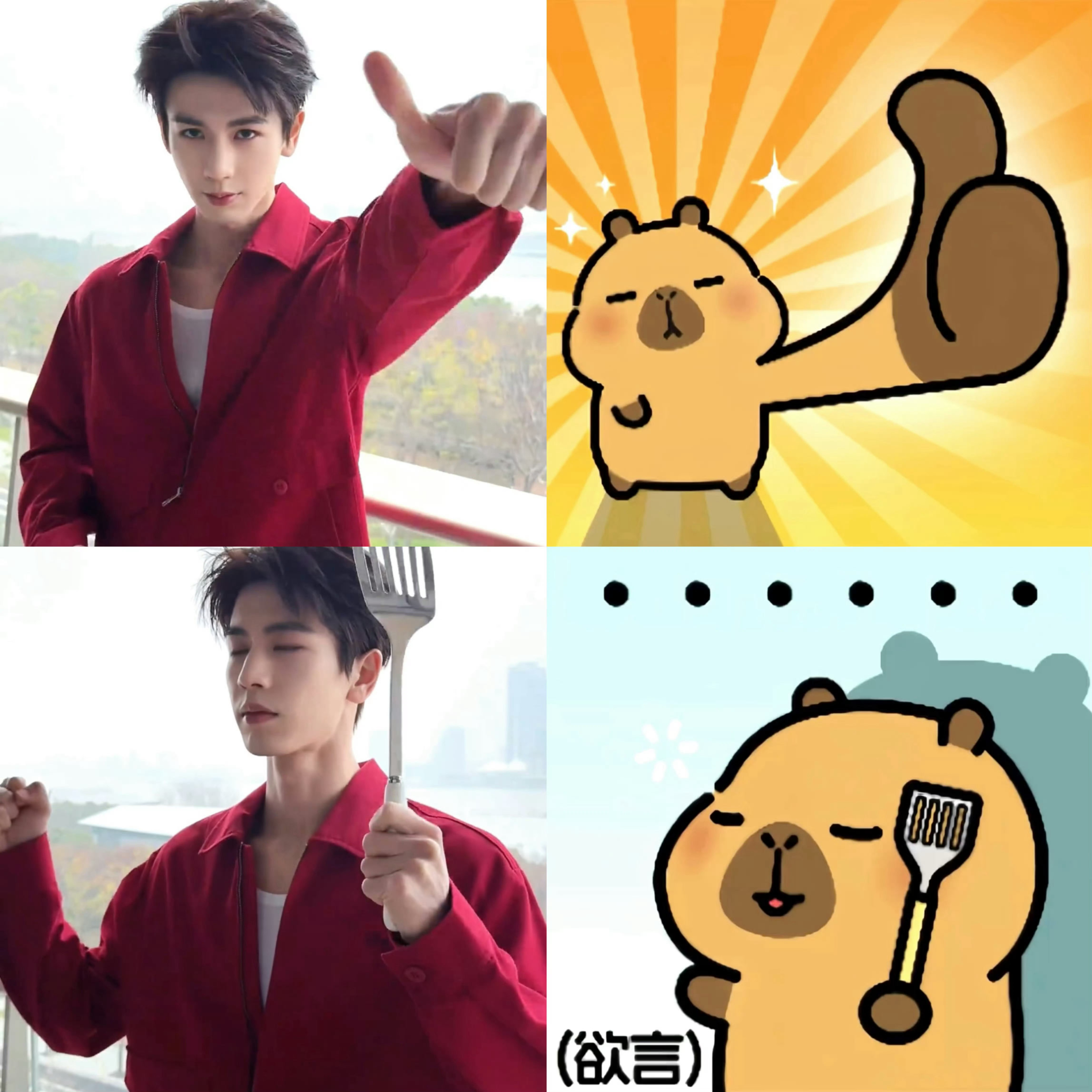 张凌赫真的太像卡皮巴拉了!直播时被调侃、遇到突发状况,他都笑着应对,一点不急躁;拍戏再累,也能保持平和的心态,不会慌慌张张。真的和卡皮巴拉的气质一模一样,看着就让人觉得治愈。张凌赫卡皮巴拉适配度一百分💯 ~