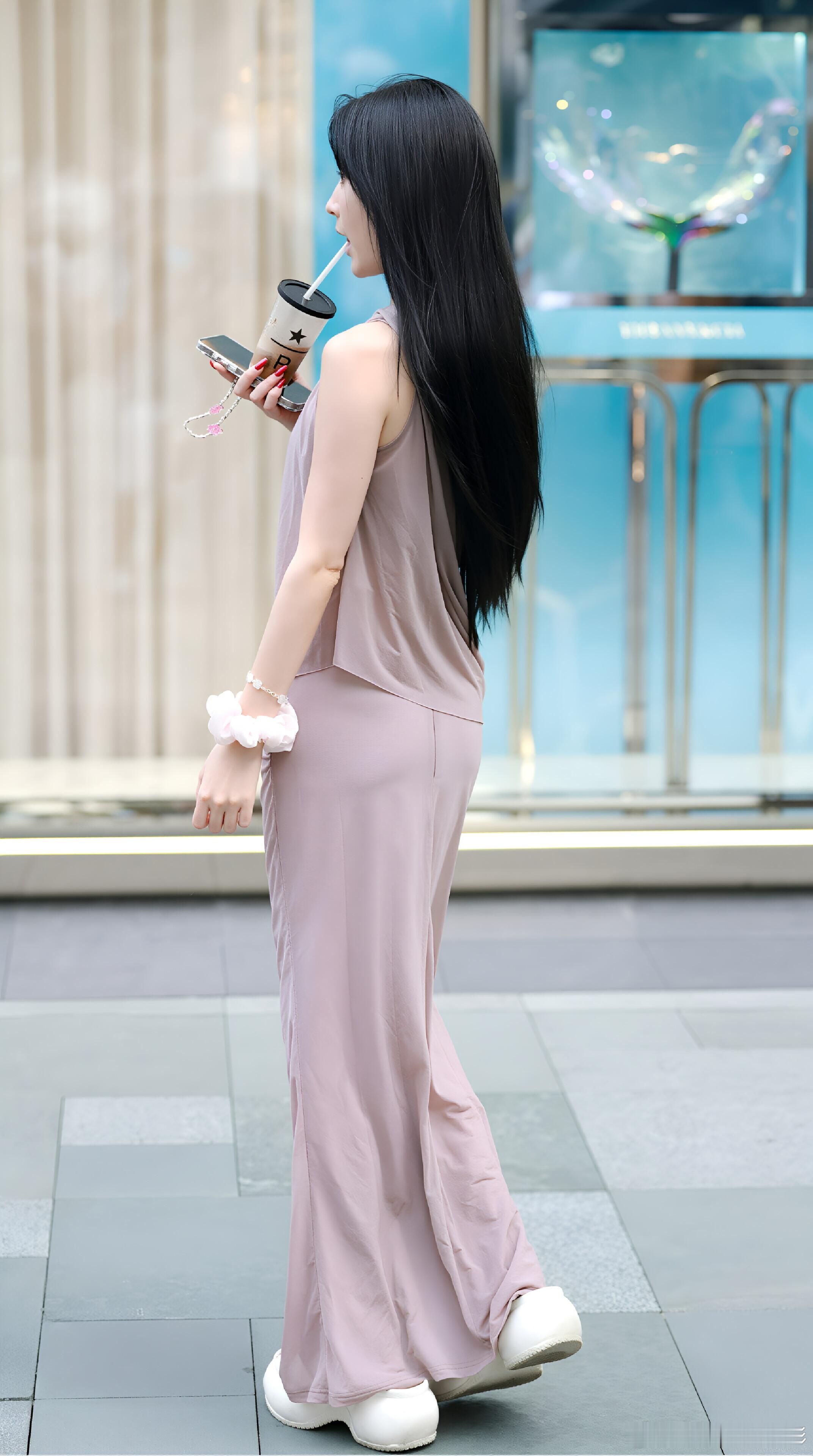 浅紫色挂脖长裙优雅显瘦,搭配白色厚底凉拖,简约中不失时尚感,尽显温柔气质与修长身姿。发现你的魅力