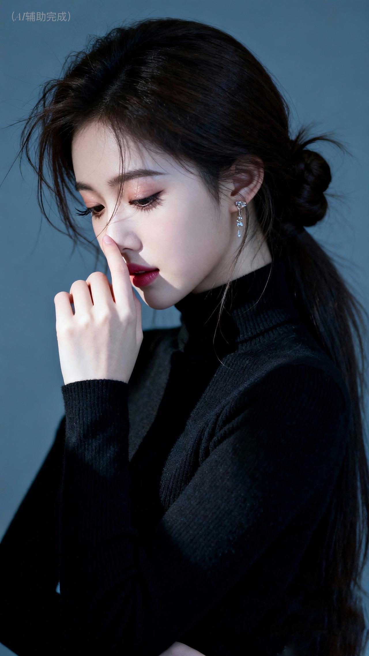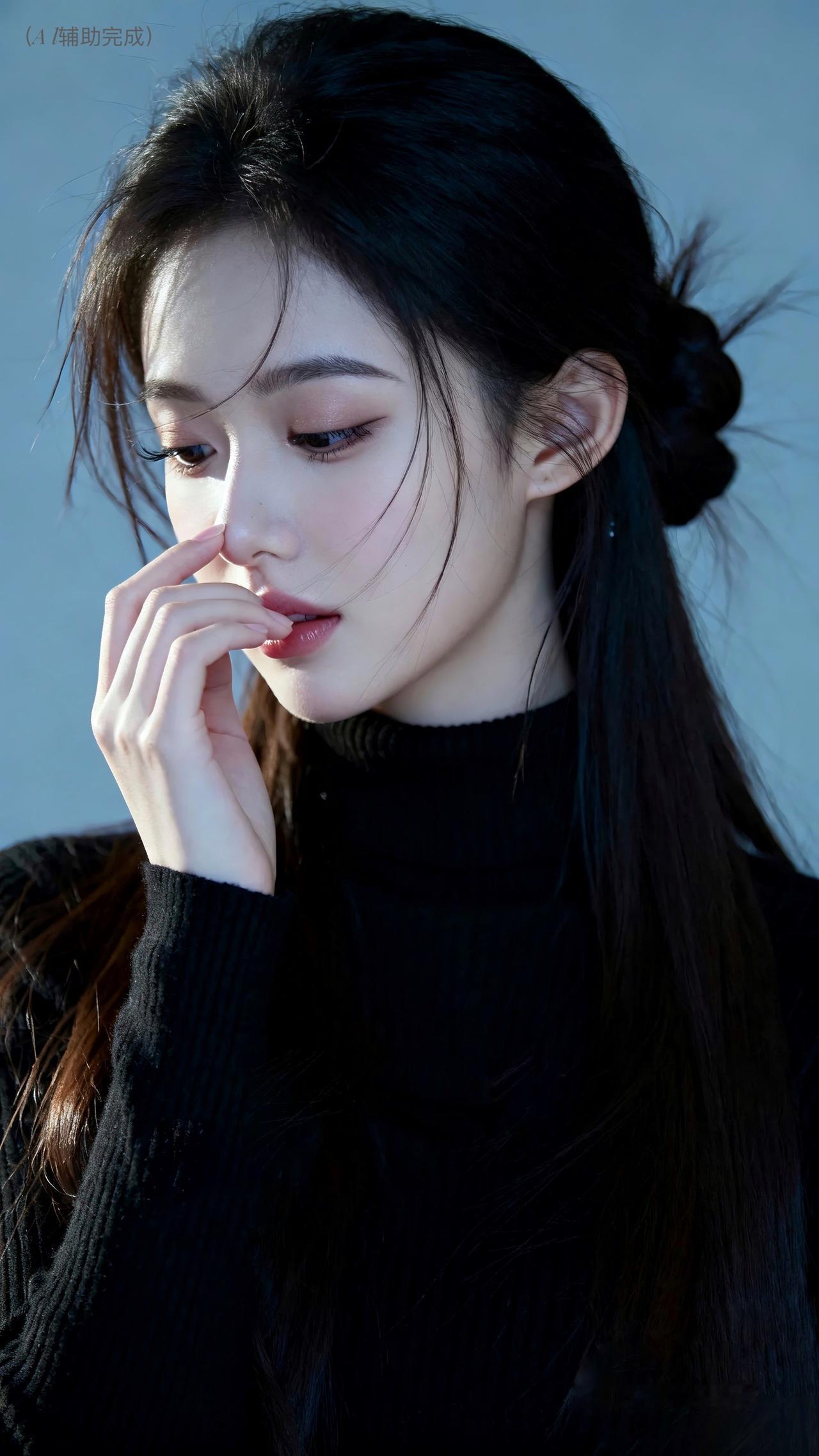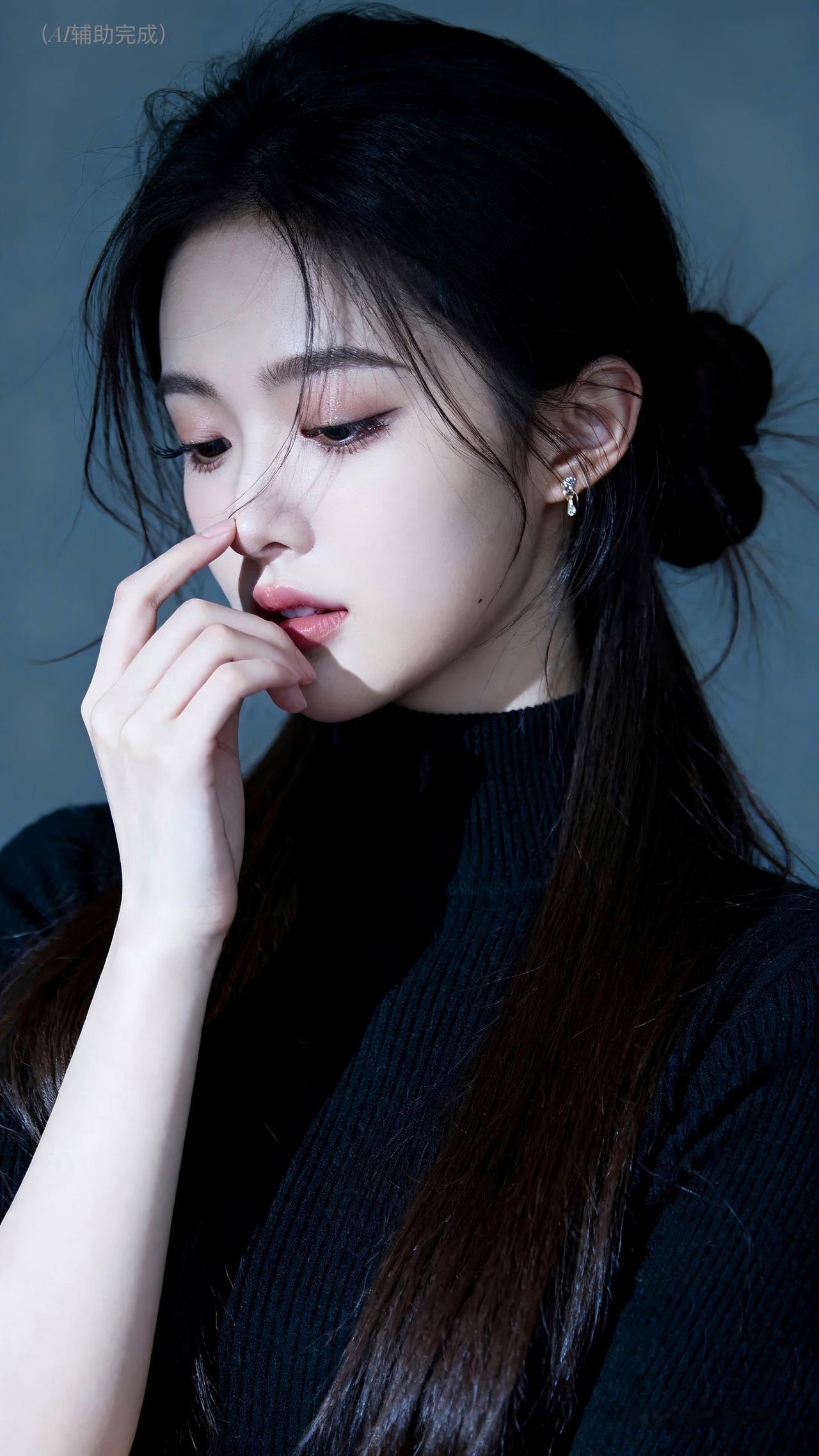乌发如瀑束低髻,碎发轻扬添柔意。黑高领毛衣裹温婉,单手轻触鼻尖姿雅。眉眼低垂眼含秋水,朱唇轻抿气自华。灰蓝静谧背景衬,光影织就娴静卷。东方含蓄美漫开,这帧温婉仙,一眼沦陷!
