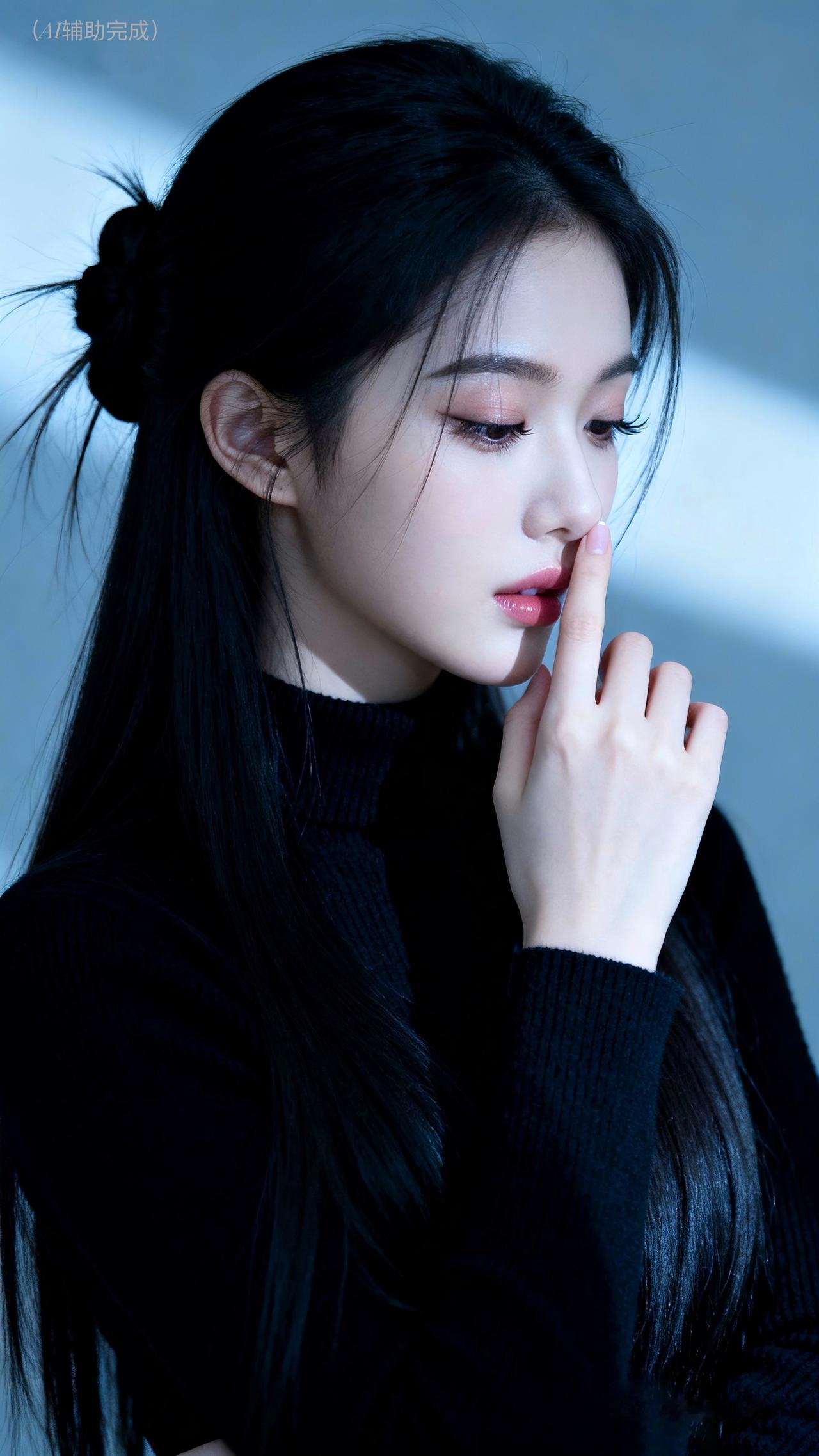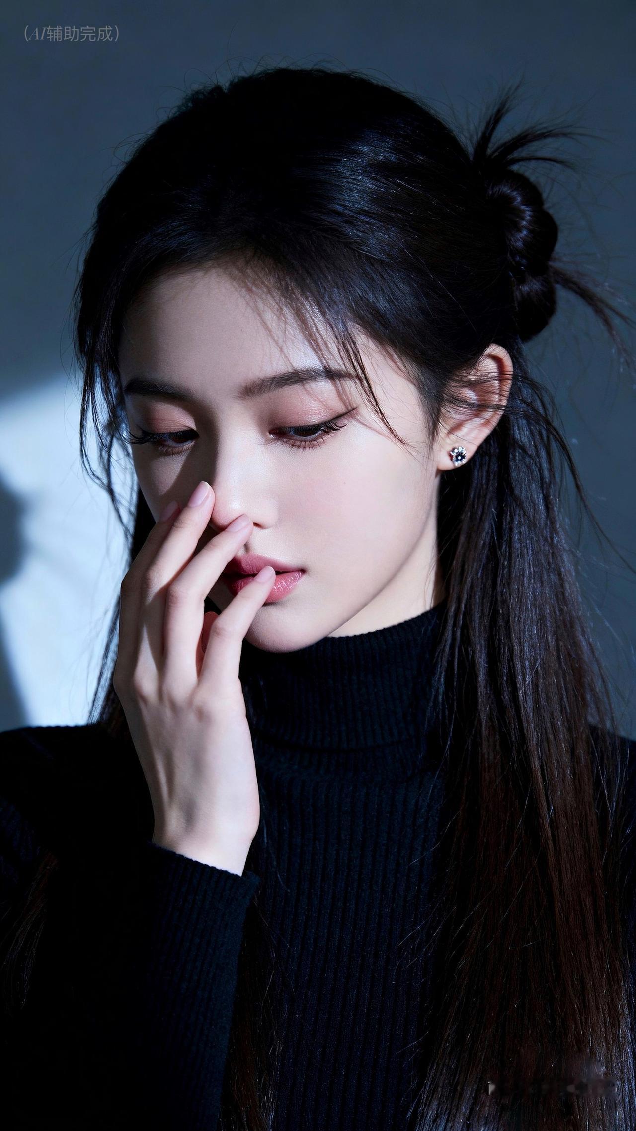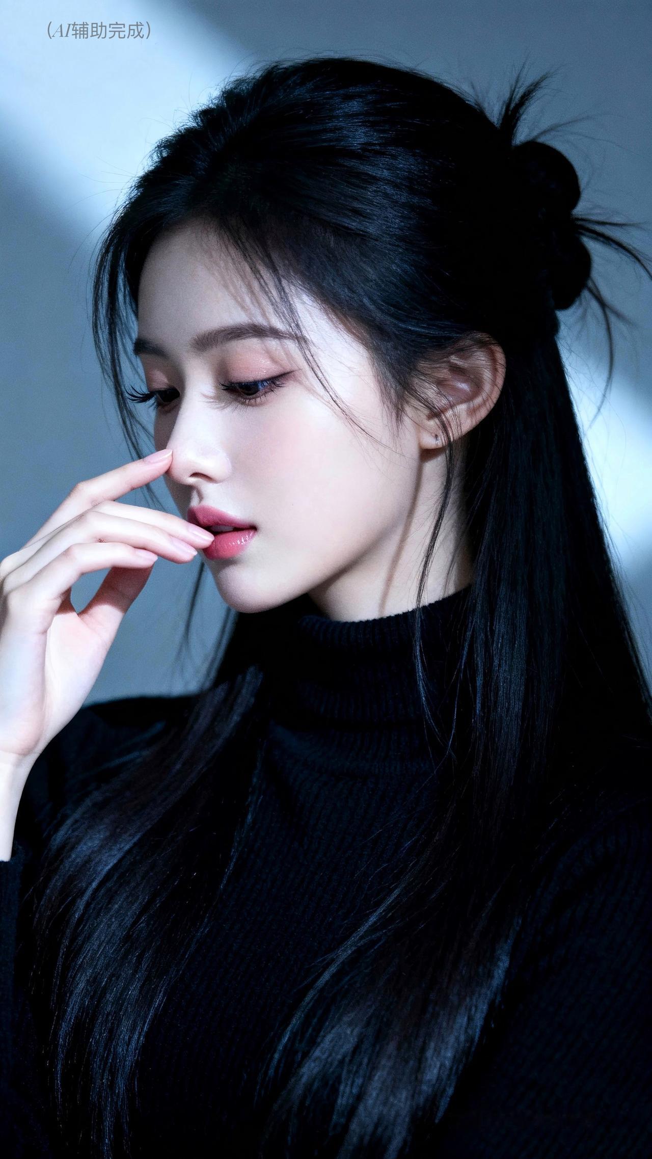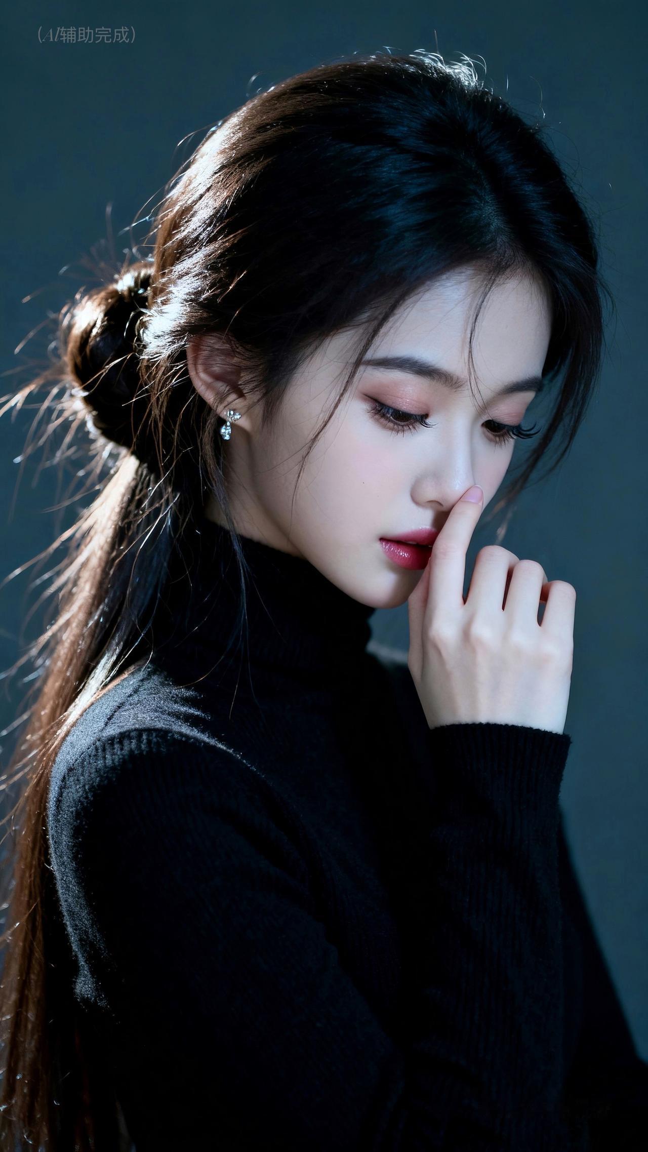 乌发如瀑束低髻,碎发轻扬添柔意。黑高领毛衣裹温婉,单手轻触鼻尖姿雅。眉眼低垂眼含秋水,朱唇轻抿气自华。灰蓝静谧背景衬,光影织就娴静卷。东方含蓄美漫开,这帧温婉仙,一眼沦陷!