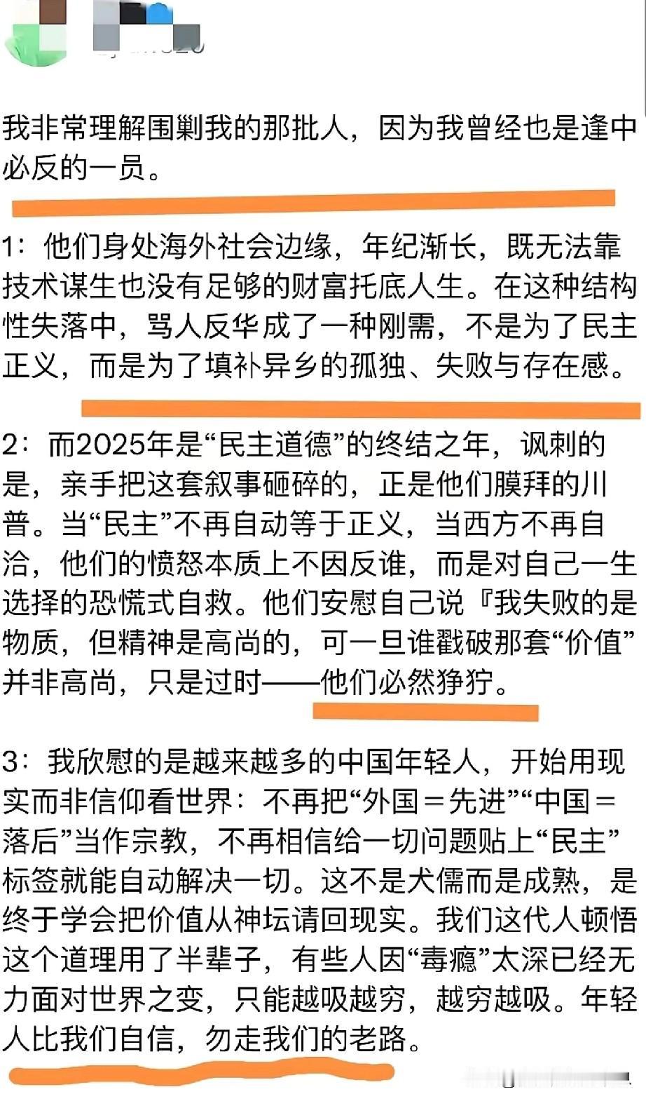牢A的话得到越来越多的人关注以后,殖人团体内部开始分裂。 有些润人替牢A说真话被“战友”围攻,他们和以前殖人一样,自我麻痹,从没仔细看过牢A的视频,只敢在脑海里构建一个反对牢A的想法,以此来证明自己的选择是对的。 如今,他们被迫面对真相,只能拼命攻击替牢A说是真话的“叛徒”。另一些润人懒得猜测真心话到底是谁说的,跟风骂同胞,甚至拿着极地的收入,掩饰自己收入惨淡,生活落魄,心里只有不甘,不甘,不甘。 还有一些人嘴硬,告诉自己,只要精神支柱不倒,滤镜就不会掉。甚至拼命反驳替牢A说真话的人,越是反驳,越说明心里慌张。 攻击牢A的“战友”越多,说明牢A触碰到了他们的痛点。他们的生活方式,我们不反对,但请不要误导年轻人。