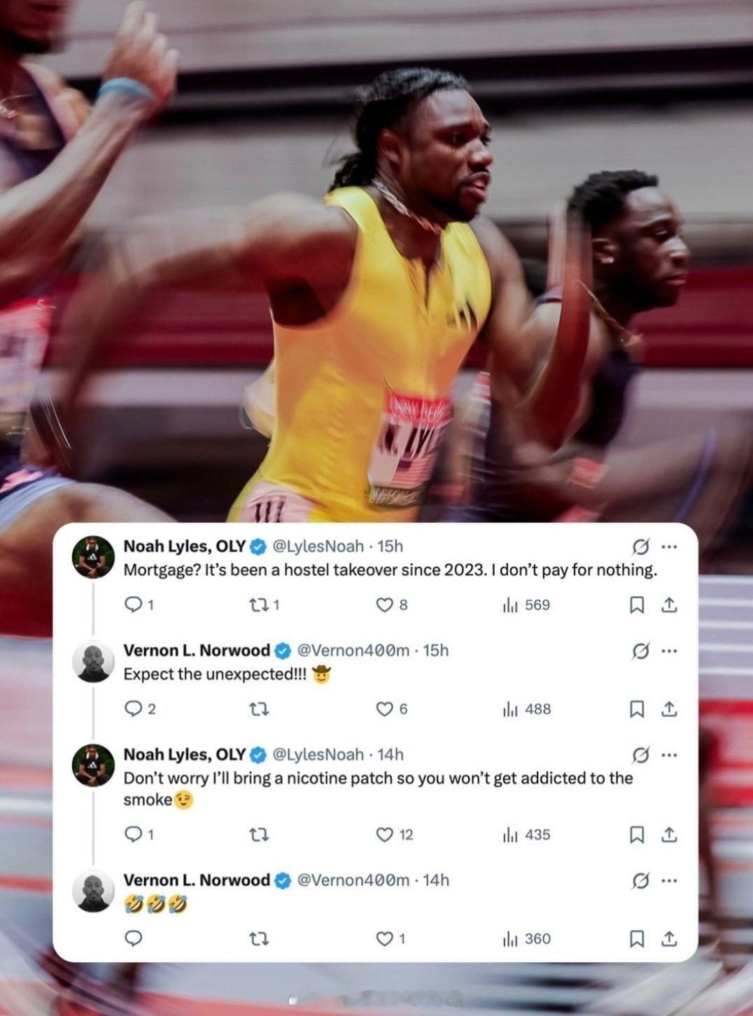 刚做好了🇺🇸莱尔斯和🇹🇹理查兹的对决海报,诺伍德和莱尔斯就互喷起来了“你的主场?你来这里要还贷!”“2023年我就接管这里,我1毛都不掏”“Expect the unexpected”(引用莱尔斯的话哈哈哈哈本次比赛名单:网页链接田径说一哈你不知道的田径故事田径 )