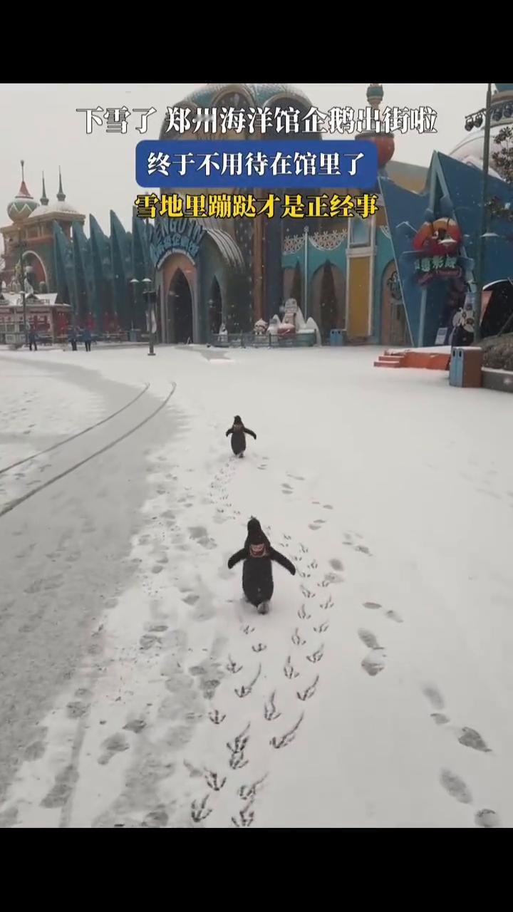 下雪了,郑州海洋馆企鹅出街啦。 终于不用待在馆里了,雪地里蹦跶才是正经事。 1月19日河南。