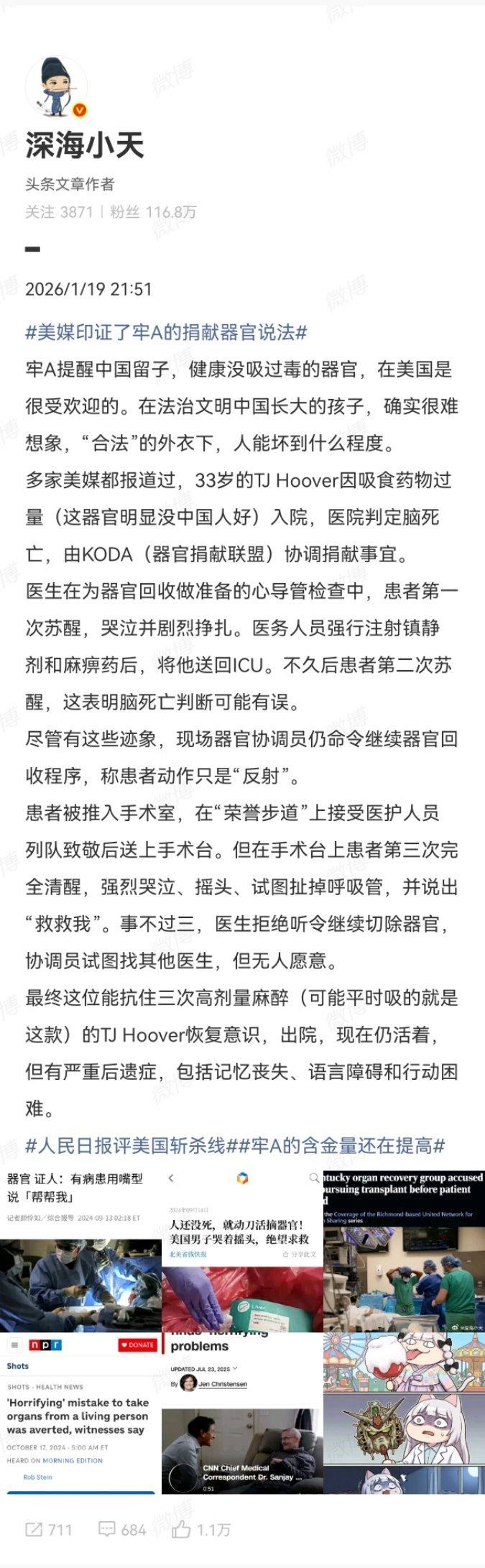 对上了,对上了! 牢A说的,跟矮大紧说的,都对上了。 矮大紧早就在节目上说过,遗体捐赠选项,在美国的驾照上就有。用他的话说是,“很有意思”。 当时,矮大紧赞赏美国的这一做法,是无私、博爱、奉献的精神。 但是在听了牢A的讲述之后,我们才知道,这背后也隐藏着冷酷、贪婪的一面。