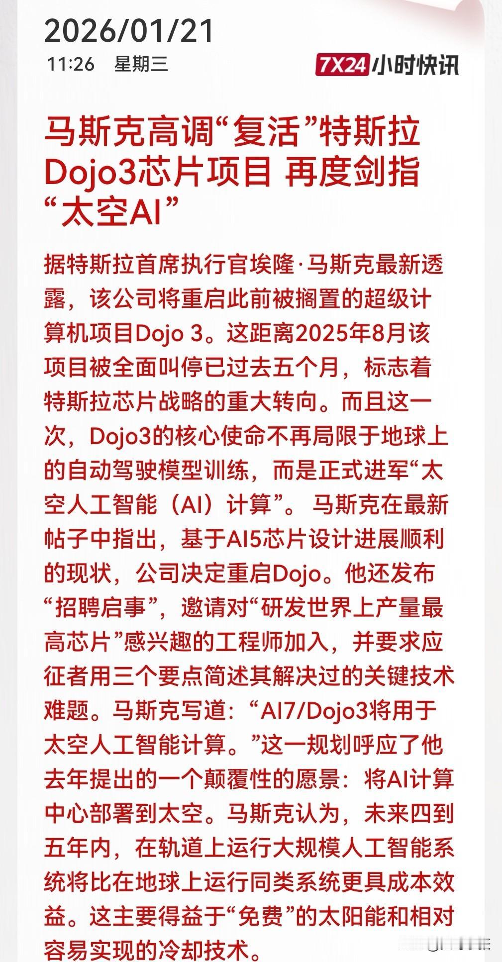 马斯克高调重启特斯拉Dojo 3芯片项目,从自动驾驶转向“太空AI”的野心彻底点燃。随着自研AI5芯片设计完成,这个一度搁置的超级计算机项目不仅承载着量产高算力芯片的技术突破,更剑指未来四到五年内将AI计算中心部署到太空的颠覆性愿景。在“免费”太阳能与高效冷却技术的加持下,太空AI计算或将成为下一代算力竞争的新战场,而Dojo 3正是这场变革的关键起点。