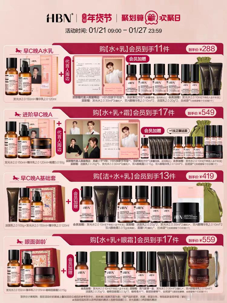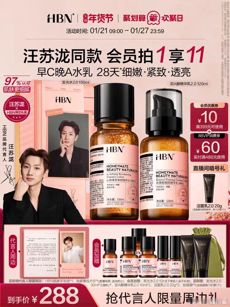 HBN颜究所HBN首位品牌代言人汪苏泷HBN真心自有回响 恭喜汪苏泷成为HBN品牌代言人,我恰好也使用了HBN高阶早C晚A¹,我就谈一下自己使用体验:一是早c容易吸收,发光水呈清爽的精华水质地,流动性强,上脸后吸收迅速,舒适。还有提亮去黄效果,改善暗沉,保湿。二是晚A(精华乳/晚霜)使用体验,精华乳为凝露质地,晚霜呈啫喱状,均质地轻盈,涂抹后迅速化水吸收,适合各种肤质。抗老紧致效果不错,皮肤更紧致了,更光滑了,从细胞源头改善。我个人觉得HBN高阶早C晚A科学的成分搭配合理、技术工艺先进和品质把控严苛,适合熬夜、皮肤暗沉等问题想极力改善皮肤的人群