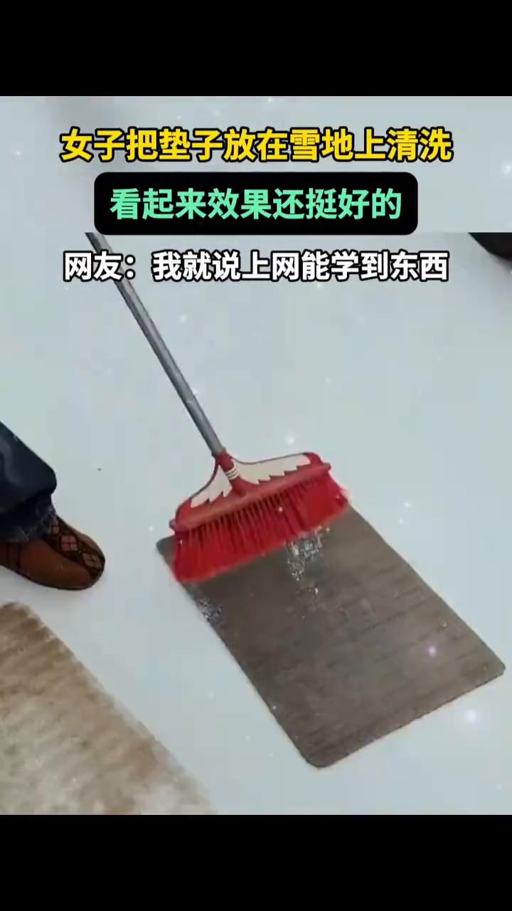 女子把垫子放在雪地上清洗,看起来效果还挺好的。网友:我就说上网能学到东西。 发布时间:(1月20号)。
