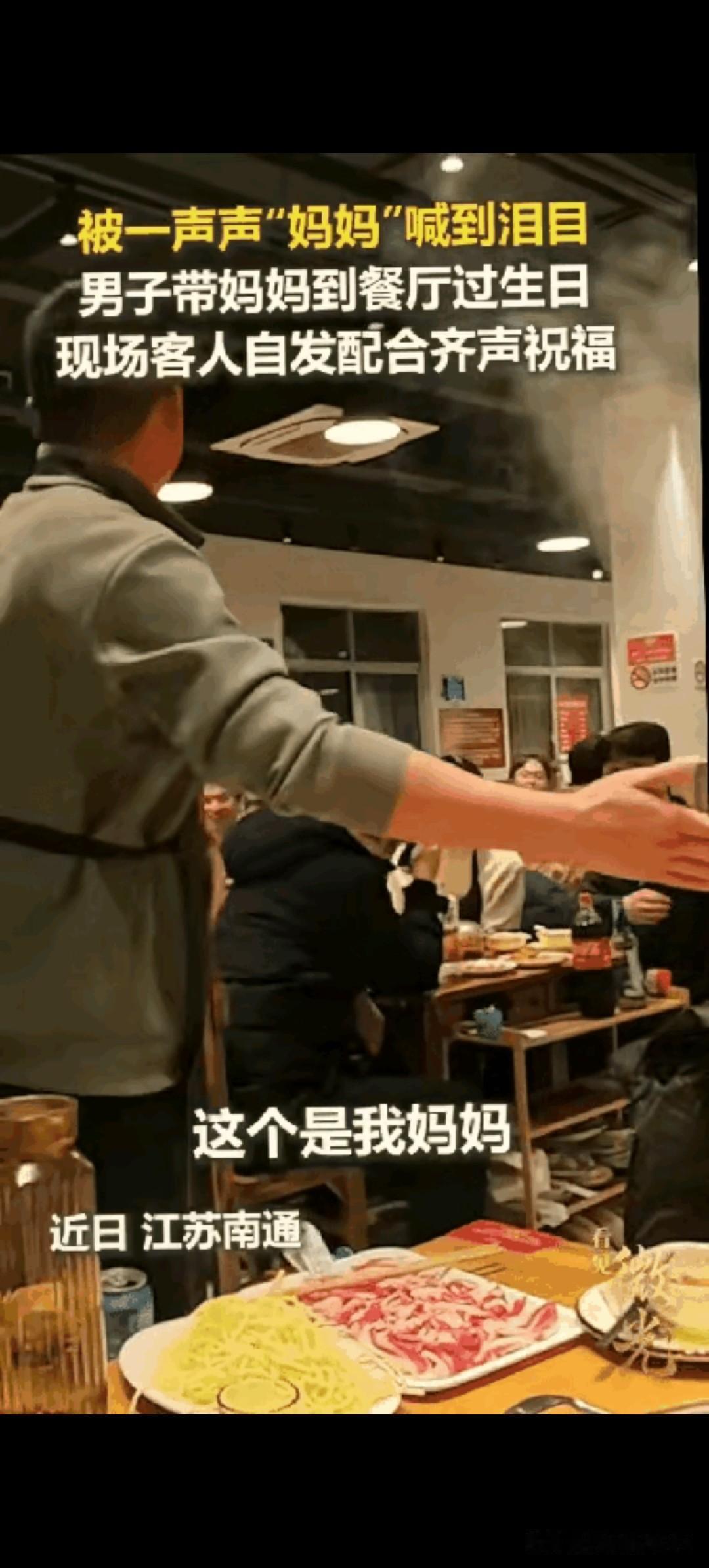 “火到人民日报了!”江苏,一男子带妈妈到餐馆过生日,吃到一半,男子突然起身,向店里客人提了个请求,妈妈当场感动落泪。 男子希望大家在他喊“妈妈”后,一起送上“生日快乐”祝福。 客人纷纷叫好。男子喊出“妈妈”,瞬间,满场“生日快乐”声响起,妈妈眼眶泛红,泪水滑落。 这小伙真的太绝了,用简单又实在的方式,给妈妈超特别的惊喜。 咱平常总不好意思表达对父母的爱,其实他们也盼着被高调宠爱。 贵重礼物比不上这份被记挂的心意。 生活匆匆,别只忙着追物质,多像这小伙一样勇敢表达爱。 也学学餐馆食客,给陌生人送温暖。你有没有这样向父母表达过爱呢?