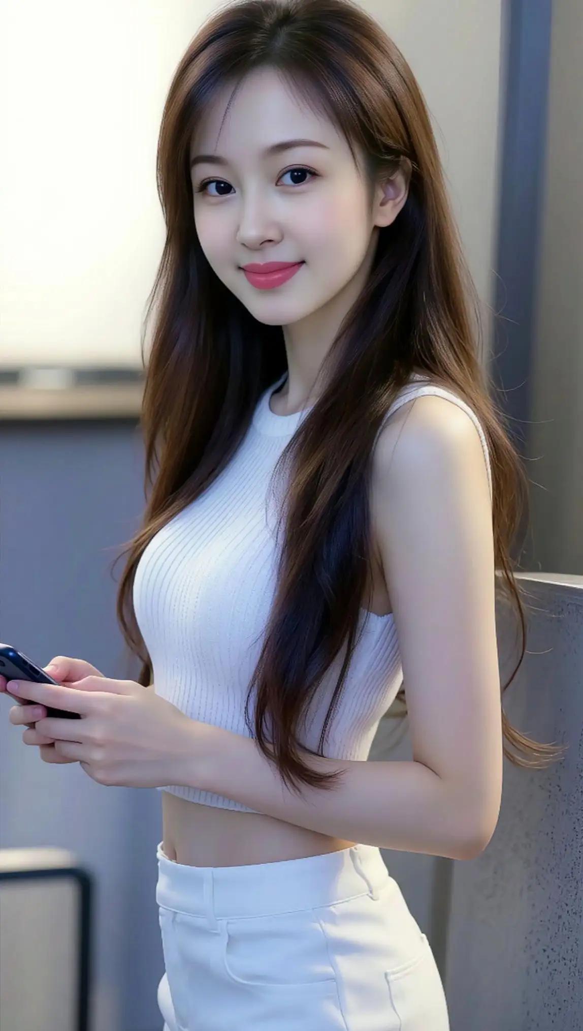 甜美少女风,白色无袖上衣搭配高腰裤,手机在手,自信满满!😊📱👗
