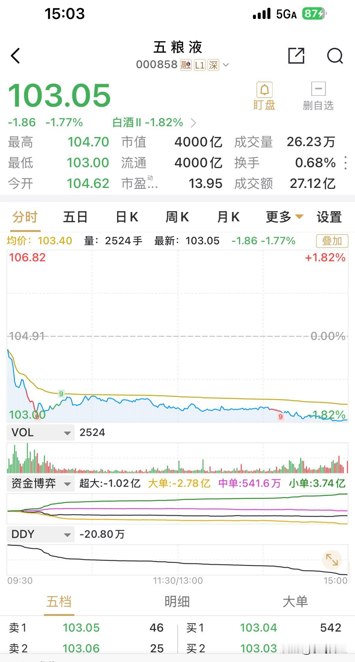 五粮液正好收在4000亿元市值,分毫不差,这下若以后每年均分红200亿元的话,股价填权的前提下,每年正好都5%的股息率啦! 当然三年分红不低于年200亿的市值管理计划,目前仅余一年半时间。2027年之后怎么分,估计要看净利润能不能触底回升。 目前来说,五粮液不破百元,彻底砸出恐慌情绪来,似乎也没有多大意思,个人也不太相信。而且白酒行业离触底,时间上也有不近的距离。 那就来吧,百分之二点的空间而已。 个人持股观点,勿作操作建议!