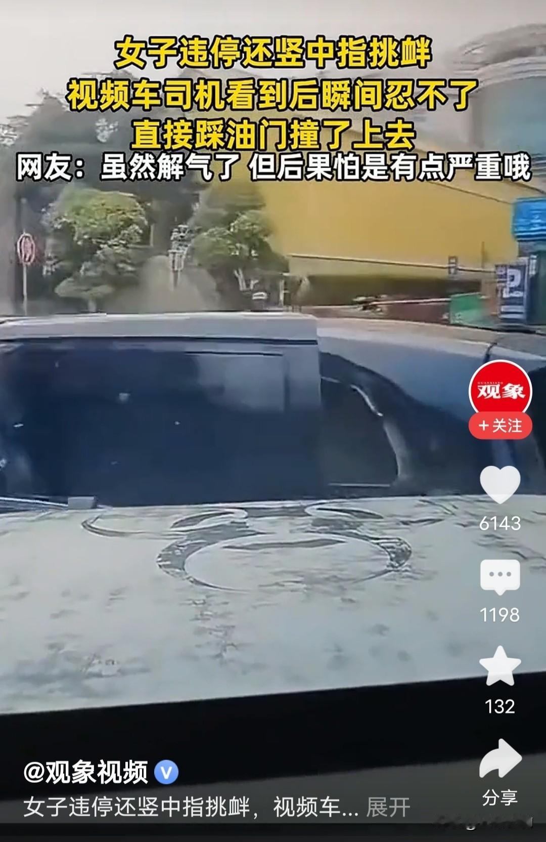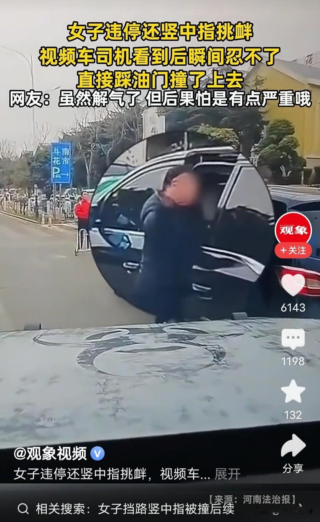 大神们,这事应该怎么判 女子违停还竖中指挑衅 视频车司机看到后瞬间忍不了 直接踩油门撞了上去 大家说说这算谁的责任啊