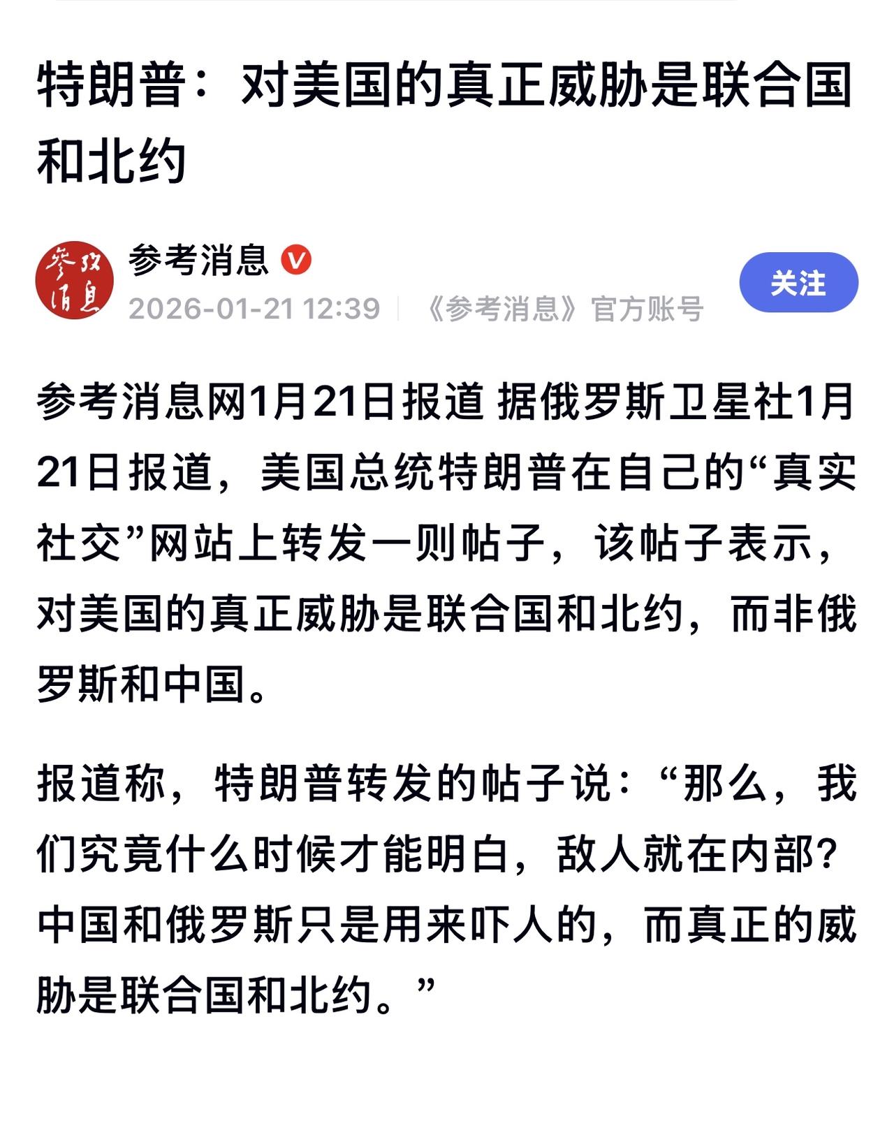 特朗普的言论看似矛盾,实则内在逻辑一致:任何不完全服从美国利益、甚至可能制约美国的多边机构,都将被他视同对手。 其根本目的是颠覆二战后的多边秩序,以“美国优先”的单边交易模式取而代之。这一做法削弱了联合国的作用及欧洲盟友的互信,正推动世界走向更加分裂和多极的局面。 另据报道:法国提议北约在格陵兰岛举行军演。