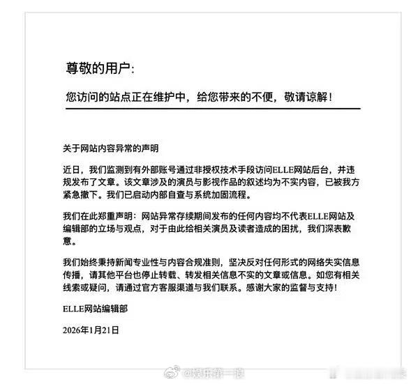 ELLE打假ELLE辟谣 elle网站郑重声明:“近日,我们监测到有外部账号通过非授权技术手段访问ELLE网站后台,并违规发布了文章。该文章涉及的演员与影视作品的叙述均为不实内容,已被我方紧急撤下。”ELLE 影视创作须回归本源