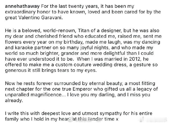 安妮海瑟薇悼念华伦天奴安妮海瑟薇的婚纱是华伦天奴定制的 21日,安妮·海瑟薇在社交网站晒照悼念华伦天奴,“过去二十年来,得到他的关爱与呵护,于我而言是莫大的殊荣。”她还提到2012结婚时华伦天奴定制的婚纱,表示“这份慷慨至今想起仍令我热泪盈眶”,两人也曾多次合作红毯造型。