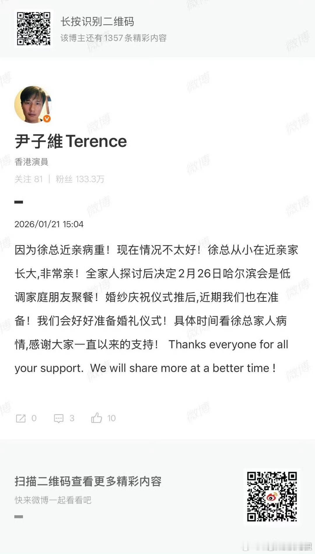 徐冬冬因家人病重婚礼延期 亲情至上!徐冬冬因家人病重暂缓婚礼,尹子维暖心发声,2.26哈尔滨婚礼简化,仪式延后筹备,愿家人康复,爱意不减。
