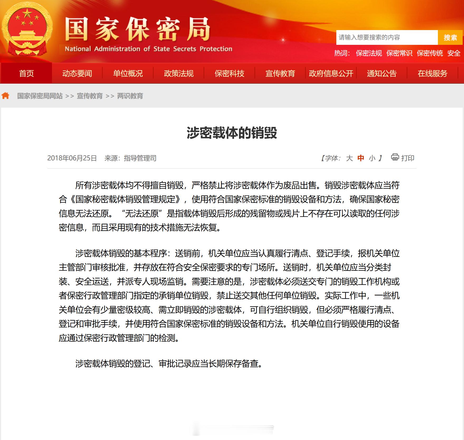 涉密单位搬迁打印机被拉到废品站 涉密单位的设备、文件等绝对不可以直接丢弃。查了一下相关要求:涉密设备、书刊文件等必须由单位统一管理,经清点登记和审批后,交由专门销毁机构或保密部门,在专人监督下采用符合保密标准的技术彻底销毁,并做好记录备查。严禁擅自处置或作为废品出售。