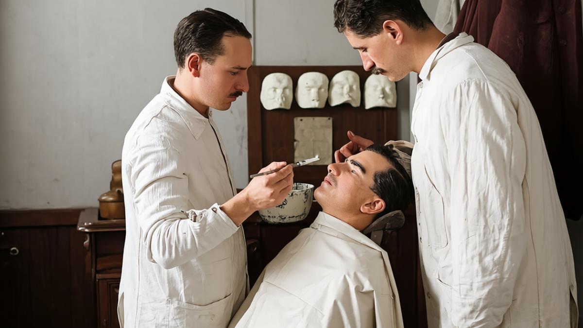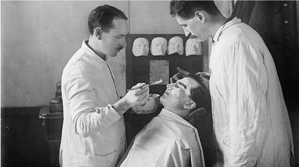 这是一张满是时代重量的照片,定格了一战时期一项特殊的医疗救治场景。 一位医护人员正手持工具,将石膏细致地敷在患者的面部,动作专注而轻柔;另一位同伴俯身观察,紧盯石膏的敷贴状态,生怕有分毫偏差。患者安静仰头配合,面部已被石膏覆盖大半。 在一战的残酷炮火中,无数士兵因弹片、灼伤留下狰狞的面部创伤,生理的残缺更伴随沉重的心理阴影。这种石膏制模技术,正是为了制作贴合患者脸型的面部面具——它不仅能遮蔽伤痕、恢复外观,更能帮助这些年轻的士兵重新建立面对生活的勇气。