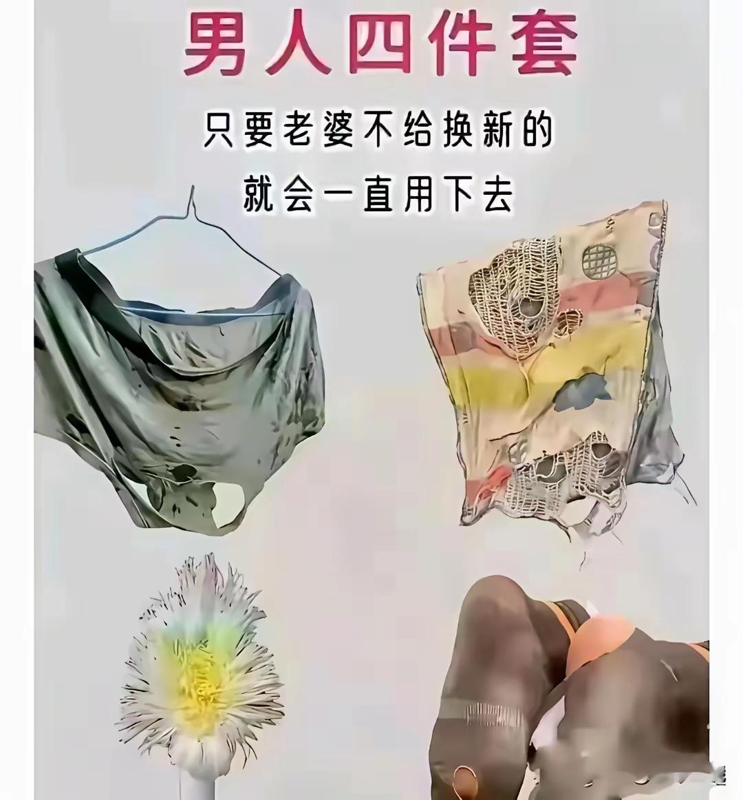 男人四件套,裤衩子,毛巾,牙刷,袿子。别说男人傻,男人主要是能将就。只要老婆不给换,一直用下去也无所谓。男人自嘲,这妥妥的巴黎世家风格,老婆不在果然是土豪!