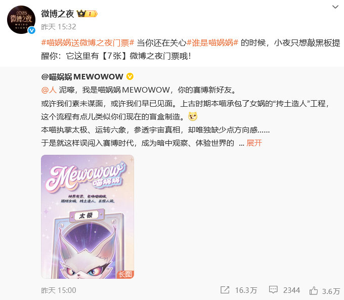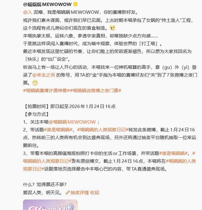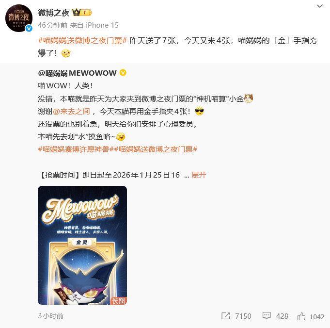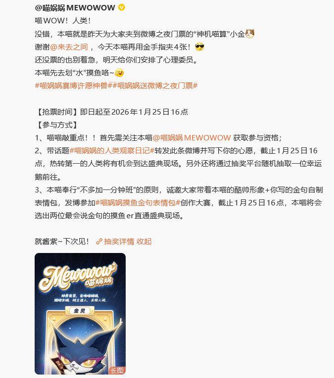 喵娲娲 夹微博之夜门票喵娲娲 谢谢来总再送4张门票 别人摸鱼被叫去谈话,摸鱼摸着摸着,把项目搞定了,还给大家整了一波票,全员集体谢喵。