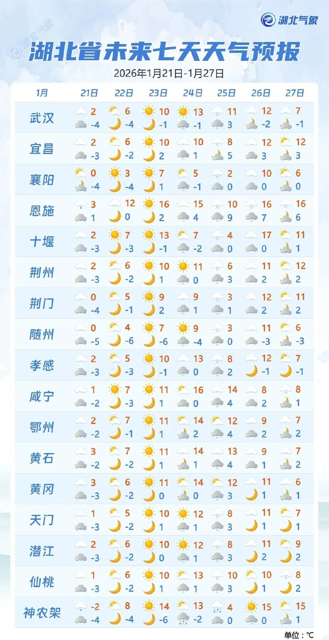 1月24日08时-1月25日08时,全省晴天转多云,夜间鄂西南局地有小雨。最高气温鄂西北7℃~11℃、其他地区11℃~16℃,最低气温-3℃~3℃,偏北风2到3级、阵风4到5级。