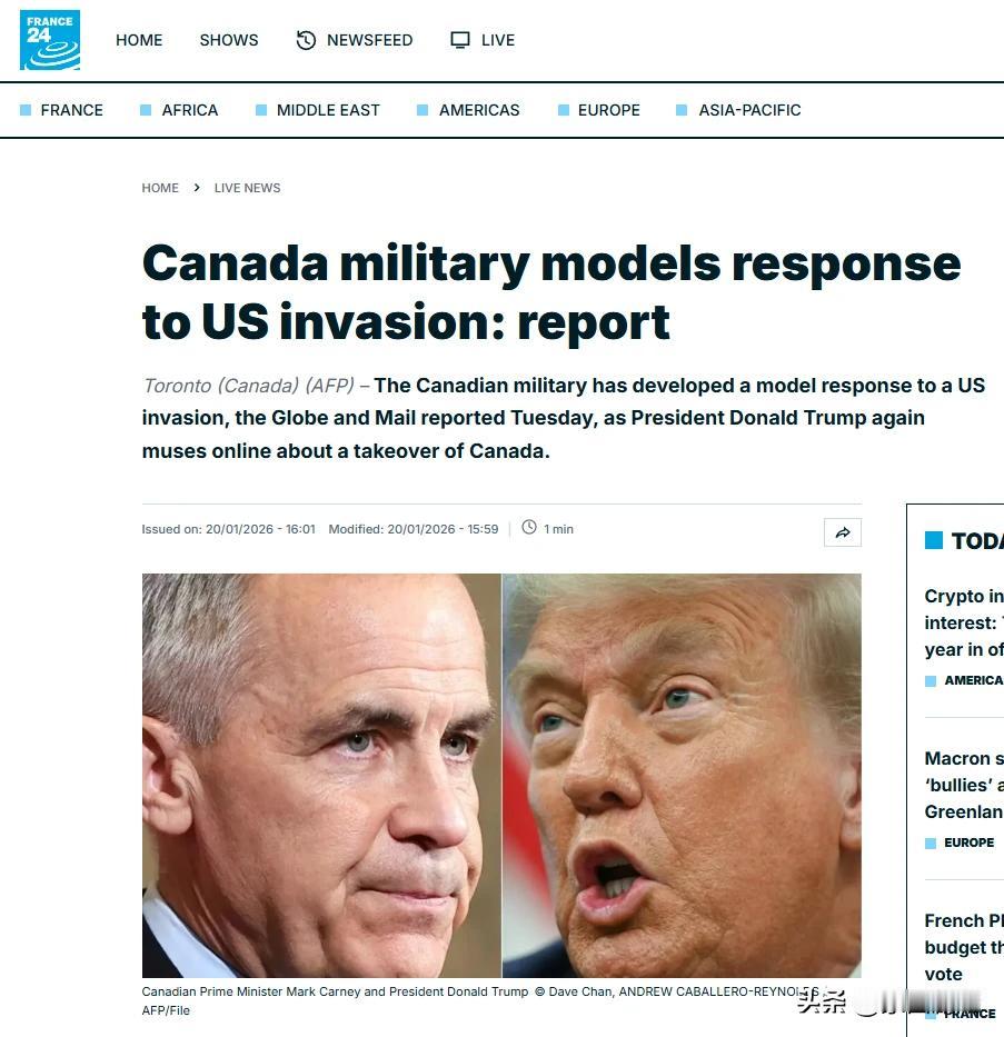 加拿大军方正在模拟美国军队可能入侵的情况。 加拿大军方承认,没有足够兵力和先进装备来阻止美国常规进攻,因此开始探索非常规战/游击式抵抗的可能性,包括伏击、破坏、无人机打击等战术,并提及参考了阿富汗战争中,反抗者的战术。 来源:france24