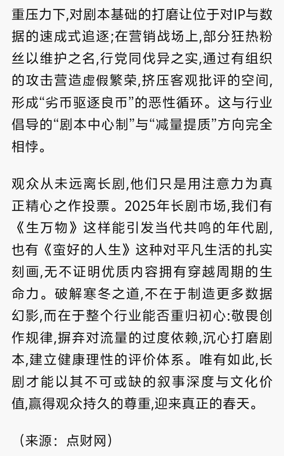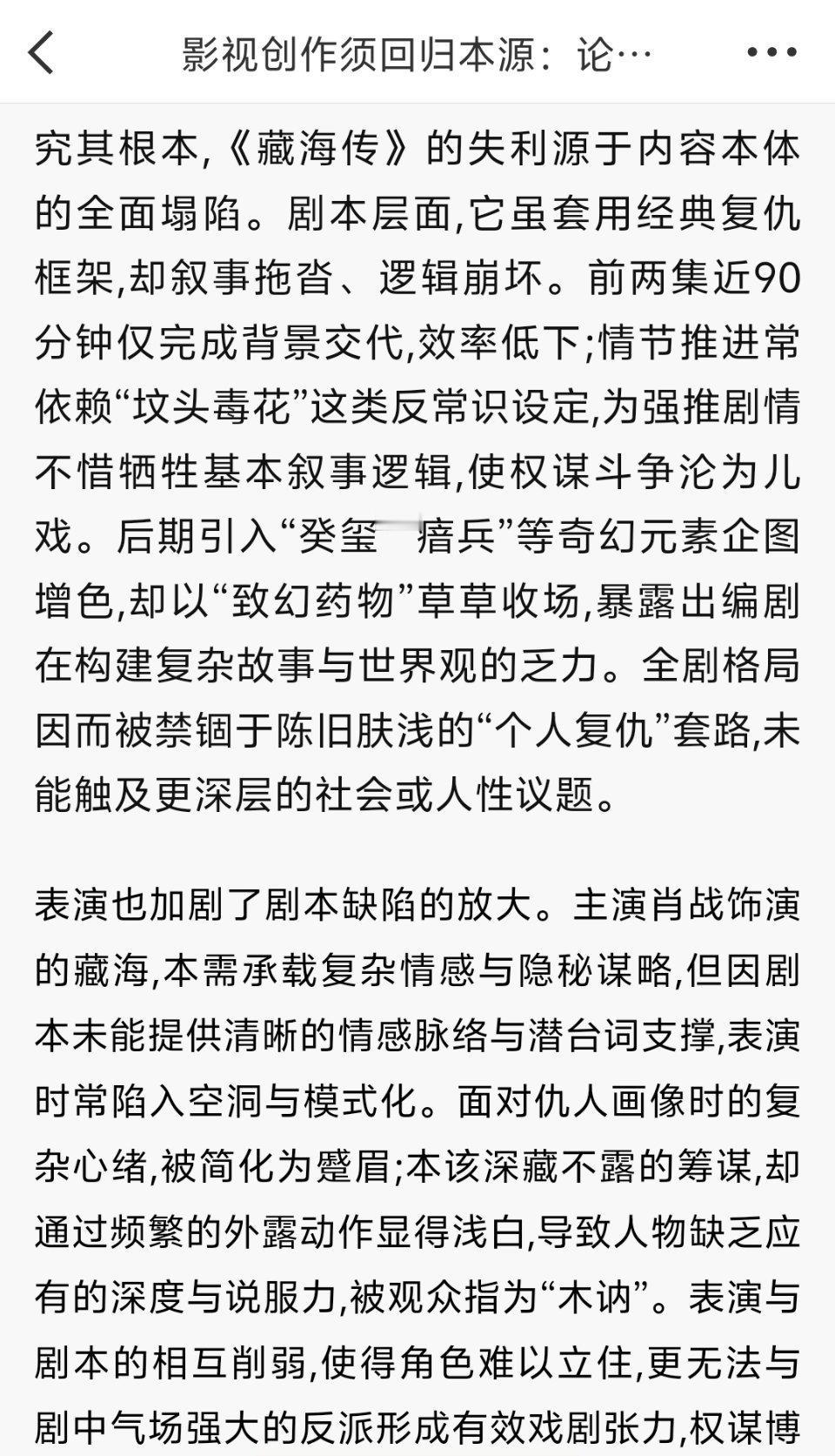 这篇藏海传剧评有什么问题?作者说的有理有据,在一片虚假的吹捧之声里,难得出现一篇客观的有格局有干货的文艺批评,其中的看法也是英雄所见略同,我之前也提过前面几集拖沓。这有什么好公关的?心虚了?大清早亡了多少年了,谁还在玩文字狱?粉丝跪求大众看她们哥哥的作品,真看了评价了又不乐意了?这篇剧评放到哪里都是合理合法的。