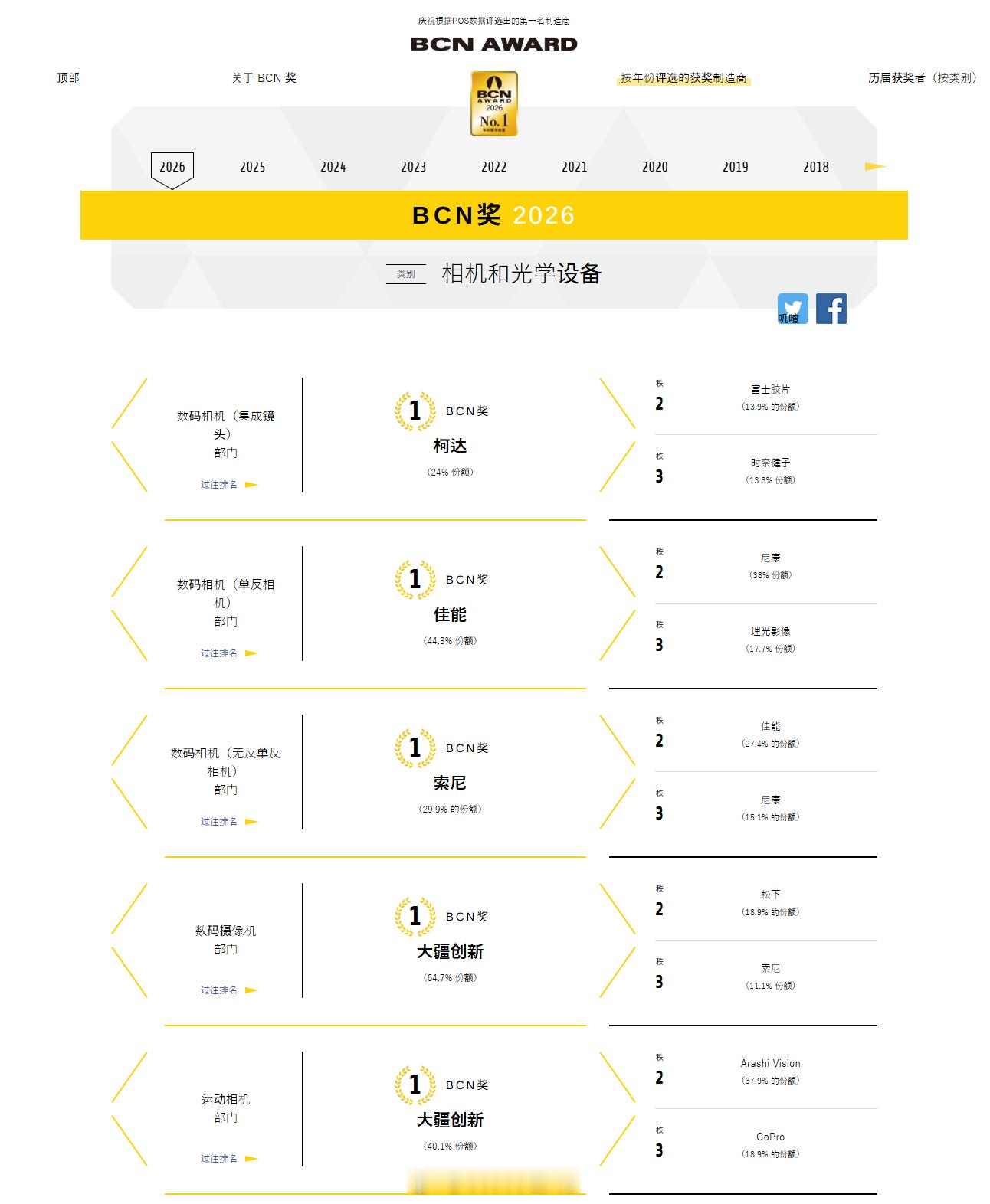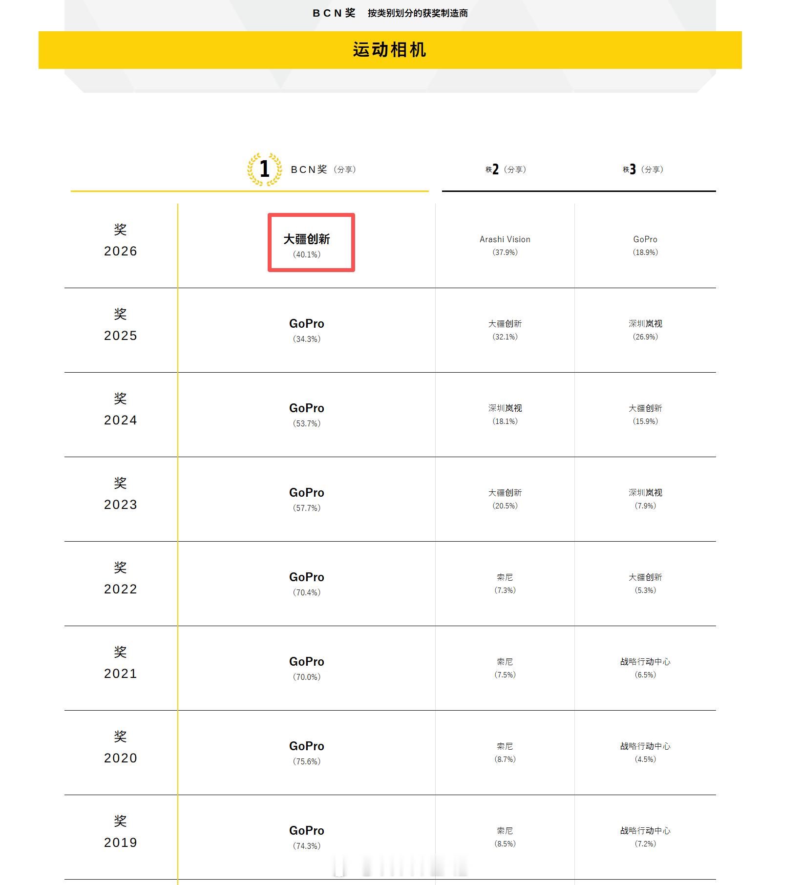 大疆在日本市场拿下 BCN AWARD 2026 两大冠军,数码摄像机品类蝉联榜首,运动相机更是首次登顶,份额冲到了 40.1%,打破了 GoPro 十年销量垄断地位。BCN AWARD 的评选标准挺严格的,是基于日本全国 2350 家大型电子产品零售商、电脑专卖店、网络商店及相机零售商的真实 POS 销售数据。不止在日本,大疆运动相机全球市场份额也很夸张,2025 年第三季度收入占全球市场份额的 66%。