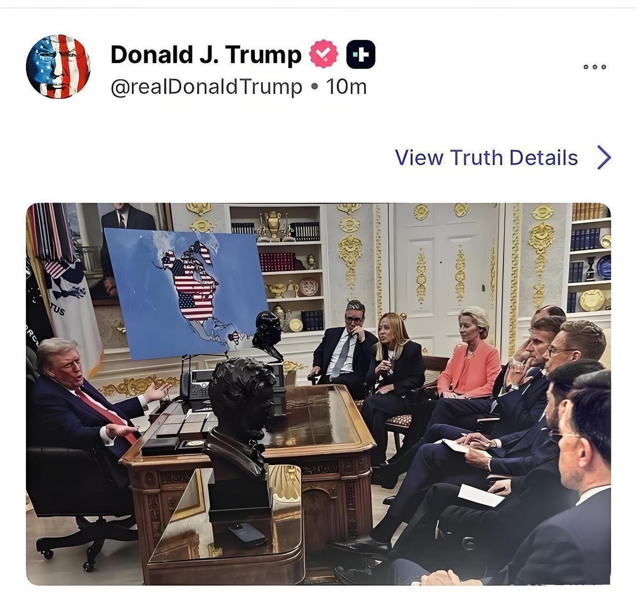 “那群欧洲小公鸡,被吓得吞下了一大把镇静剂!” 梅德韦杰夫火上浇油,让美国和欧盟开大,并直接调侃特朗普,想成为普京那样的总统你还做不到! 特朗普在一张照片上,把地图中的格陵兰岛,加拿大,委内瑞拉涂成星条旗的颜色。 也就是去年,欧洲七巨头组团访美为泽连斯基出头,却挨个被特朗普“打脸”之事的图片。 他还发布了另一张照片,里面写着“2026年,格陵兰岛成为美国领土”。 西方地缘博弈的虚伪面纱,有一次被撕开了,这就是: 特朗普一直存在开阔疆土的想法,希望自己能和开国先贤们并列,想永载史册。 同时,也是普京的迷弟,只要一见到普京,就像一个小男孩见到了橄榄球队长,满怀敬畏。 做着想着成为普京那样总统的春秋大梦,妄图效仿普京的风范! 这不过是东施效颦的闹剧! 梅德韦杰夫说,他惦记的是别人的岛屿,满脑子都是霸权掠夺,普京守护的是俄罗斯世代传承的故土! 特郎普要想永载史册,还不如把英国纳入美国版图。这样的话,美国人就可以控制欧洲,南美洲和整个北美。