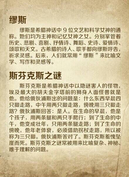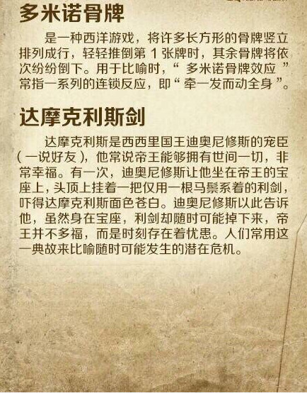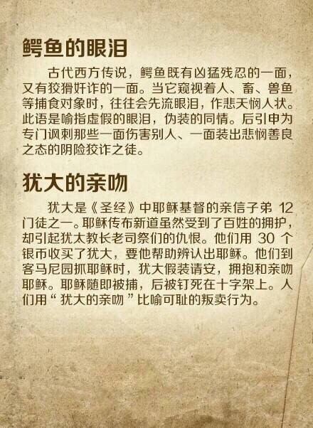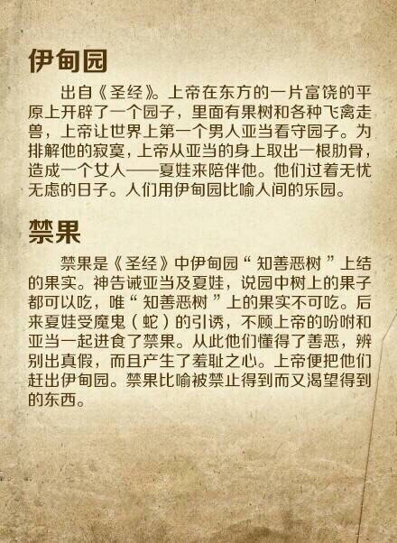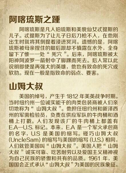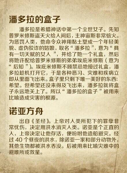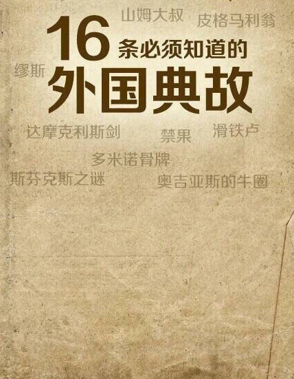 【16个你必须知道的外国著名典故】1.潘多拉的盒子 2.诺亚方舟 3.象牙塔 4.滑铁卢 5.鳄鱼的眼泪 6.犹大的亲吻 7.伊甸园 8.禁果 9.多米诺骨牌 10.达摩克利斯剑 11.缪斯 12.斯芬克斯之谜 13.皮格马利翁 14.奥吉亚斯的牛圈 15.阿喀琉斯之踵 16.山姆大叔…你知道几个?