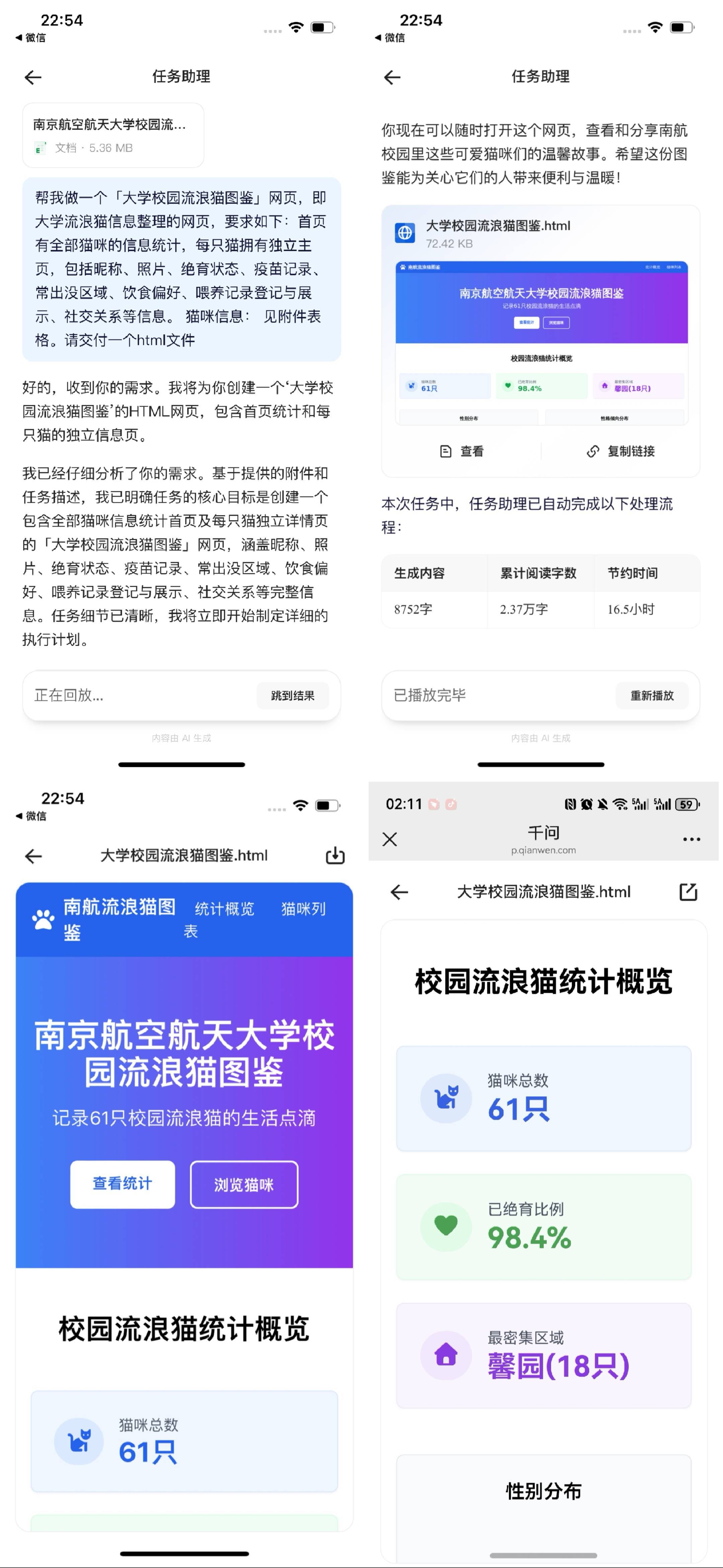 告别靠缘分投喂!南航学生们用千问任务助理为校园流浪猫手搓一套「数字猫籍」!以前猫一多就脸盲,现在每只猫都有专属档案:年龄、健康状态、绝育情况一目了然。投喂情况也能同步更新,志愿者再也不用在群里刷屏式寻猫了。节约下的人力财力,可以为小猫们买更多猫条啦!没有技术背景,普通人也能借助AI工具发起可持续的公益实践~千问给流浪猫办了电子身份证千问上线能干活的任务助理自由的小猫不叫流浪猫